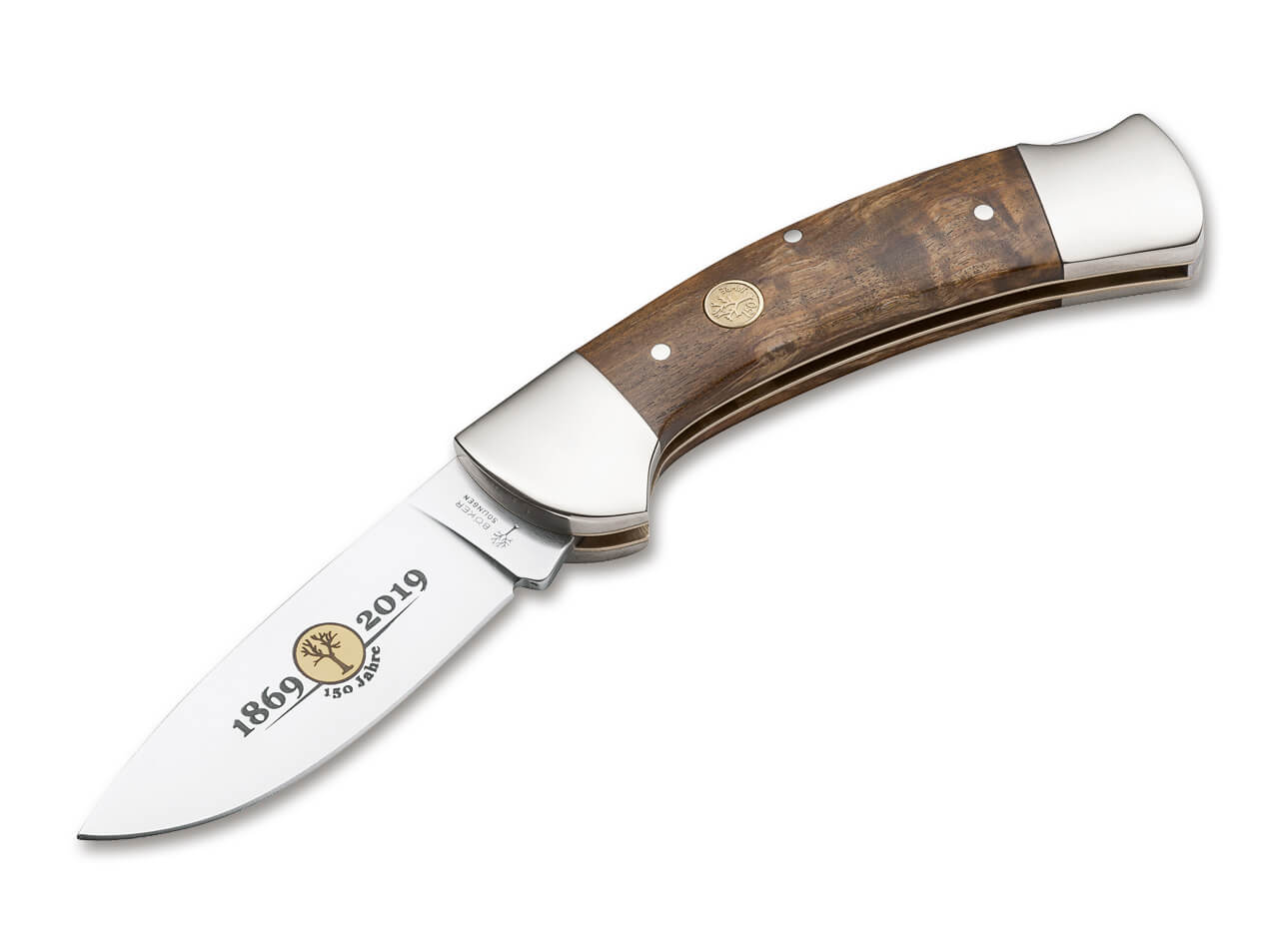 Selbstverständlich begehen wir unser 150-jähriges Jubiläum auch mit einer breiter aufgestellten Sonderedition, die auf ausgesuchten Modellen der Böker-Historie aufbaut. Jedes der ausgewählten Modelle ist ein wichtiger Teil unserer Firmengeschichte, und so stellt diese Auswahl gewissermaßen einen Abriss unserer Firmengeschichte dar, vom ältesten aller Böker-Messer, dem Sportmesser, bis hin zu neueren Modellen wie zum Beispiel dem Cub. Diese Modelle sind ausgestattet mit einer Beschalung aus braun stabilisierter Maserbirke.