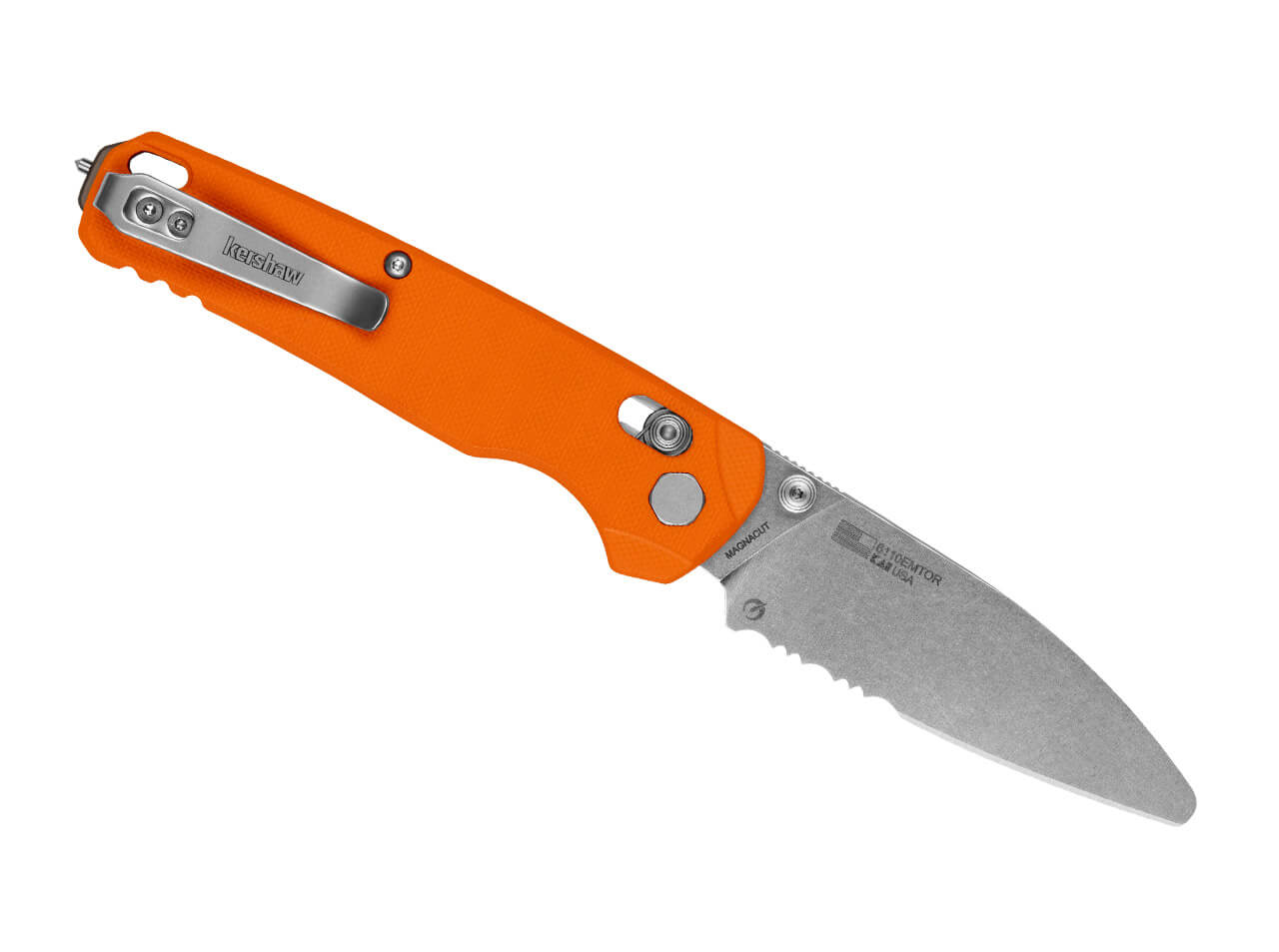 Das Kershaw Bel Air XL – EMT Orange Taschenmesser richtet sich an Rettungskräfte, Ersthelfer und alle, die auf höchste Zuverlässigkeit angewiesen sind. Die CPM MagnaCut-Klinge kombiniert hervorragende Schnitthaltigkeit mit einer robusten BlackWash™-Oberfläche, die Alltagsabnutzung kaschiert. Die stumpfe Spitze minimiert das Risiko von Durchstichen, während die teilwellenförmige Klinge mühelos Gurte, Seile oder Kleidung schneidet.