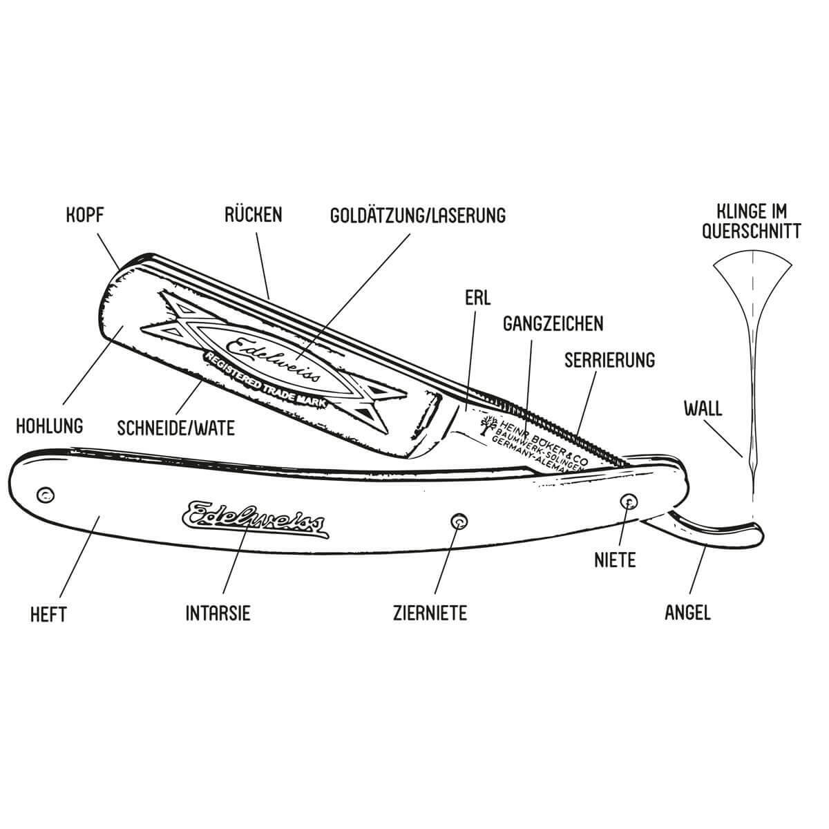 Trotz des industriellen Fortschritts seit Gründung der Böker Manufaktur im Jahr 1869 werden noch heute bei der Herstellung eines Böker Rasiermessers teilweise historische Fertigungstechniken angewandt. In jedem Fall erhalten bleibt die Leidenschaft, Erfahrung und Perfektion bei der Auswahl der verwendeten Materialien und bei der Durchführung der einzelnen Produktionsschritte, welche wir im Folgenden gerne vorstellen. In der Schmiede ist das Ausgangsmaterial zunächst ein Rundstab, der auf Länge geschnitten wird – es entsteht das sogenannte Spaltstück. Das Spaltstück wir bis zur Rotglut erwärmt und mit einem Fallbär von 690 kg Gewicht im Gesenk geschmiedet. Hiernach müssen die Rohlinge zwei Tage lang im Glühofen bis auf 200°C auskühlen. Auf einer Presse mit 200 Tonnen Druck werden die Rohlinge gerichtet, bevor sie in die Härterei gehen. Hier wird durch die thermische Behandlung die optimale Kombination von Schnitthaltigkeit und Elastizität des Stahles erzeugt. In der Schleiferei werden die Rohlinge von Hand in 18 einzelnen Arbeitsschritten vom Grobschleifen über das Walken bis hin zum Pließten geschliffen. Wir schleifen unsere Rasiermesserklingen ausschließlich extrahohl mit Wall (eine Ausnahme bildet der Wiener Schaber). Der Wall liegt vor der starken Hohlung und kurz hinter der Wate, die selbst wieder einen kleinen Hohlschliff aufweist. Nur durch den Wall lassen sich die Klingen in dieser hauchdünnen Materialstärke ausschleifen und behalten trotz ihrer Elastizität genügend Steifigkeit. Weltweit beherrscht nur eine kleine Handvoll der hochspezialisierten Schleifer diese Königsklasse der Rasiermesserherstellung. Anschließend werden die Klingen von Hand mit Neusilbernieten, Unterlegscheiben, Distanzstück und Schalen vernietet. Hierbei erfordern die Naturmaterialien Holz und Horn Fingerspitzengefühl, da diese bei zu viel Druck reißen können. Zu guter Letzt erfolgt der letzte Abzug von Hand auf mehreren Bankschleifsteinen mit feiner werdenden Körnungen. Nach dem abschließenden Ledern wird die Schärfe des Rasiermessers an einem frei gehaltenen Kopfhaar getestet. Jedes Rasiermesser verlässt so Rasur fertig unsere Manufaktur.