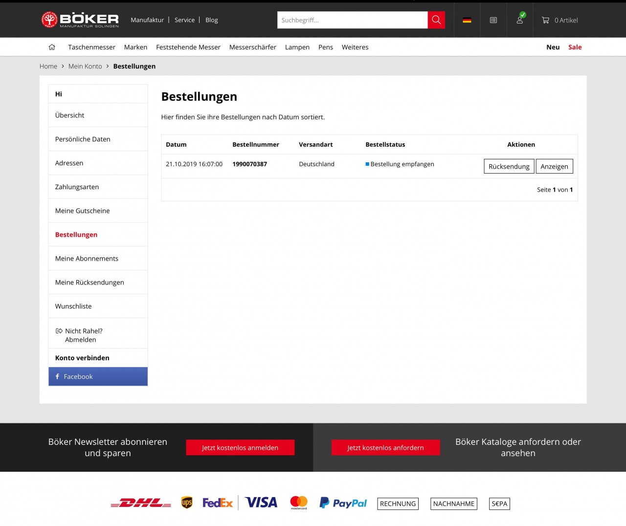 - Melden Sie sich mit Ihren Benutzerdaten an und gehen Sie zur Übersicht Ihrer Bestellungen. Hier wählen Sie bei der entsprechenden Bestellung "Rücksendung" aus.