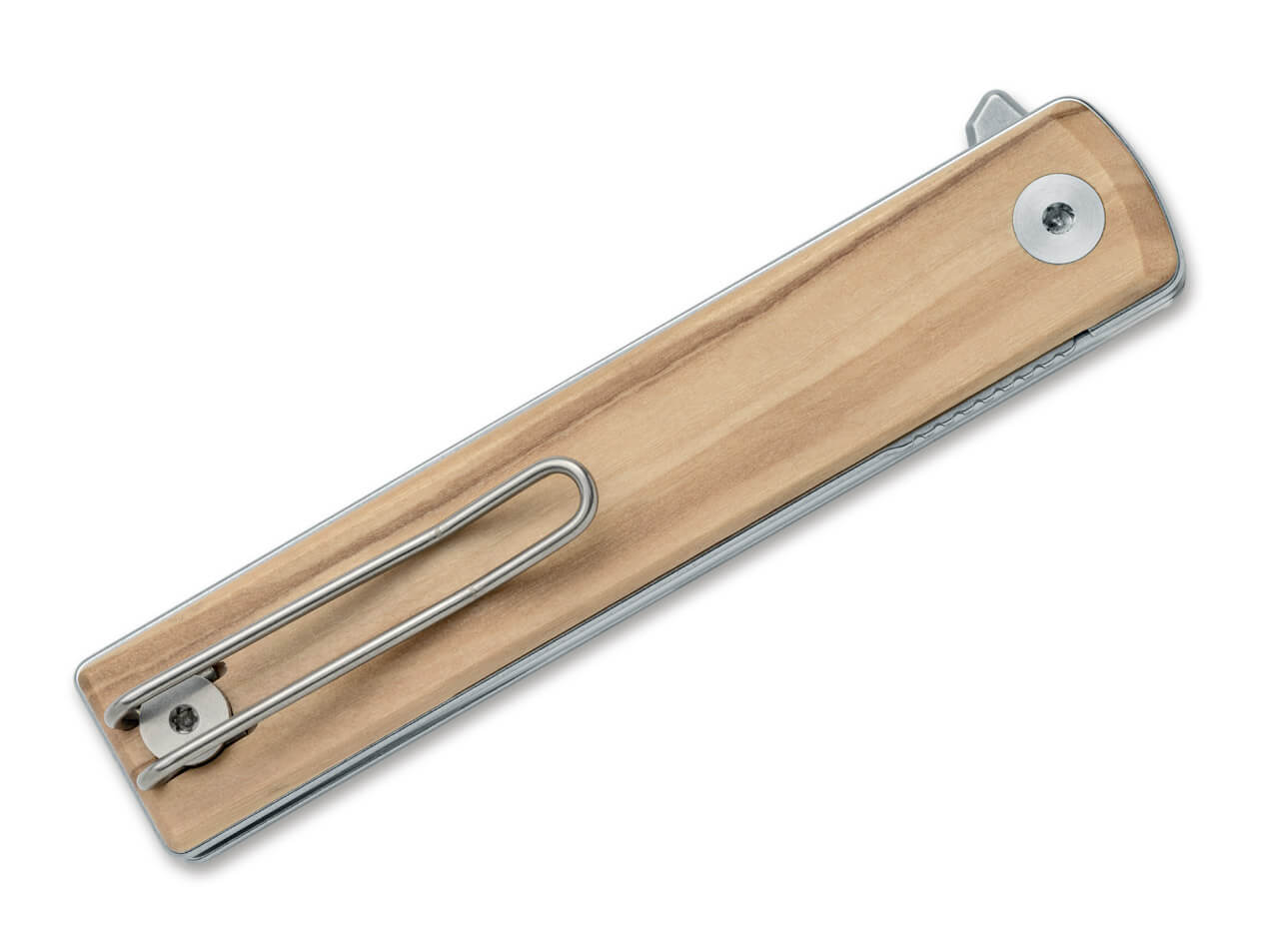 Der Flipper erlaubt ein schnelles und intuitives Öffnen der Klinge, während der Liner Lock für sichere Verriegelung sorgt. Der Griff aus hochwertigem Olivenholz liegt ergonomisch in der Hand, vermittelt ein edles, traditionelles Gefühl und macht jedes Messer zu einem einzigartigen Sammlerstück. Ein umsetzbarer Tip-Up Draht-Clip ermöglicht diskretes Tragen und flexible Befestigung in der Tasche. Hochwertige Schrauben und Spacer aus Edelstahl runden die Verarbeitung ab und gewährleisten Langlebigkeit und Präzision.