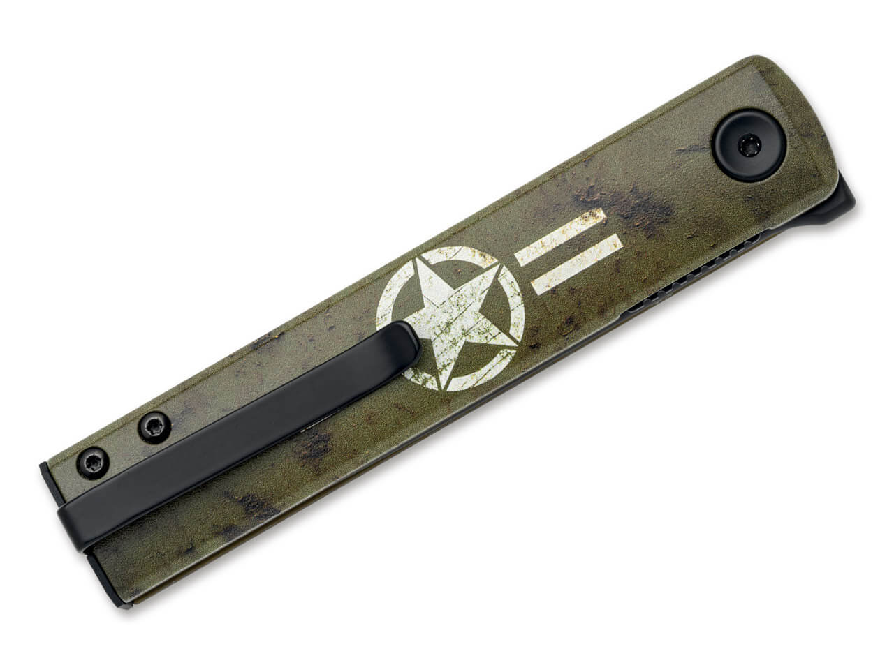 Die Klinge aus schwarzem Becut Top Shield Stahl sorgt für präzises Schneiden und hohe Zuverlässigkeit im Alltag. Der Griff aus eloxiertem Aluminium trägt ein auffälliges Armee-Motiv mit UV-Druck, das dem Messer eine starke visuelle Identität verleiht.