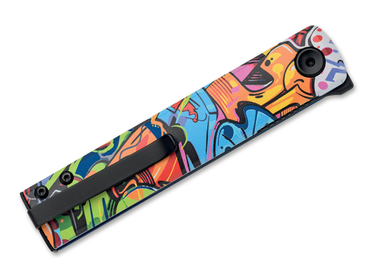 Die Klinge aus schwarzem Becut Top Shield Stahl sorgt für präzises Schneiden und hohe Zuverlässigkeit im Alltag. Der Griff aus eloxiertem Aluminium trägt ein auffälliges Graffiti-Motiv mit UV-Druck, das dem Messer eine starke visuelle Identität verleiht.
