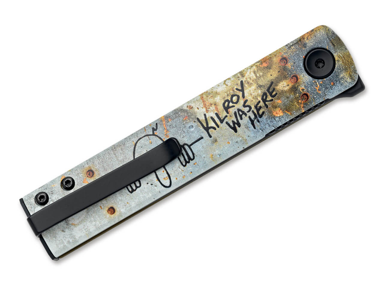Die Klinge aus schwarzem Becut Top Shield Stahl sorgt für präzises Schneiden und hohe Zuverlässigkeit im Alltag. Der Griff aus eloxiertem Aluminium trägt ein auffälliges Kilroy was here-Motiv mit UV-Druck, das dem Messer eine starke visuelle Identität verleiht.
