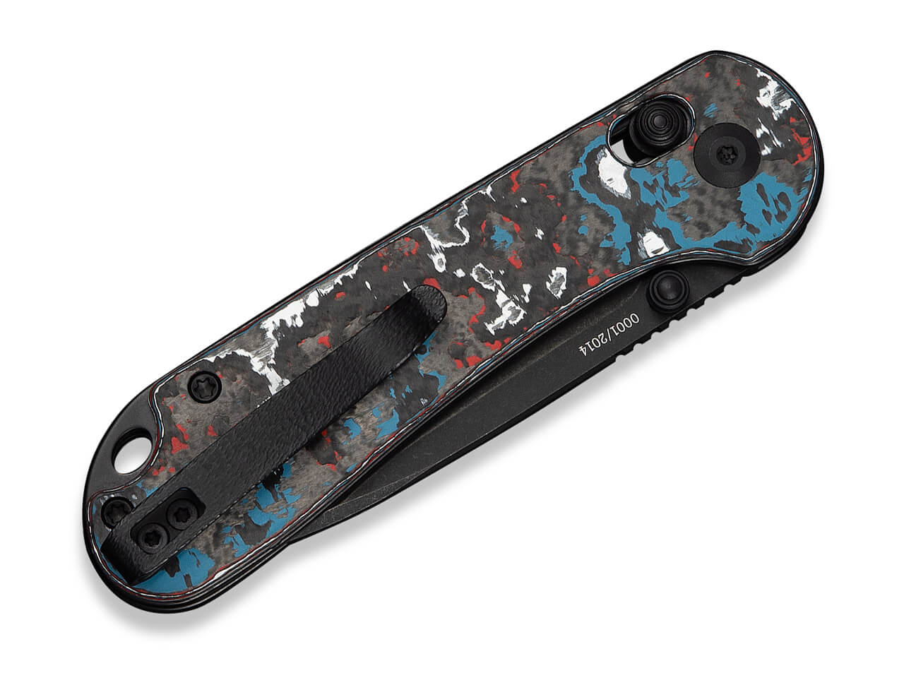 Der Griff aus Nebula FatCarbon Fiber in Schwarz, Rot, Blau und Weiß verleiht dem Messer eine auffällige, moderne und individuelle Optik mit hoher Stabilität und geringem Gewicht. Die integrierten Stainless Steel Liner sorgen für zusätzliche Festigkeit, während das Design insgesamt eine hochwertige und technische Anmutung vermittelt.