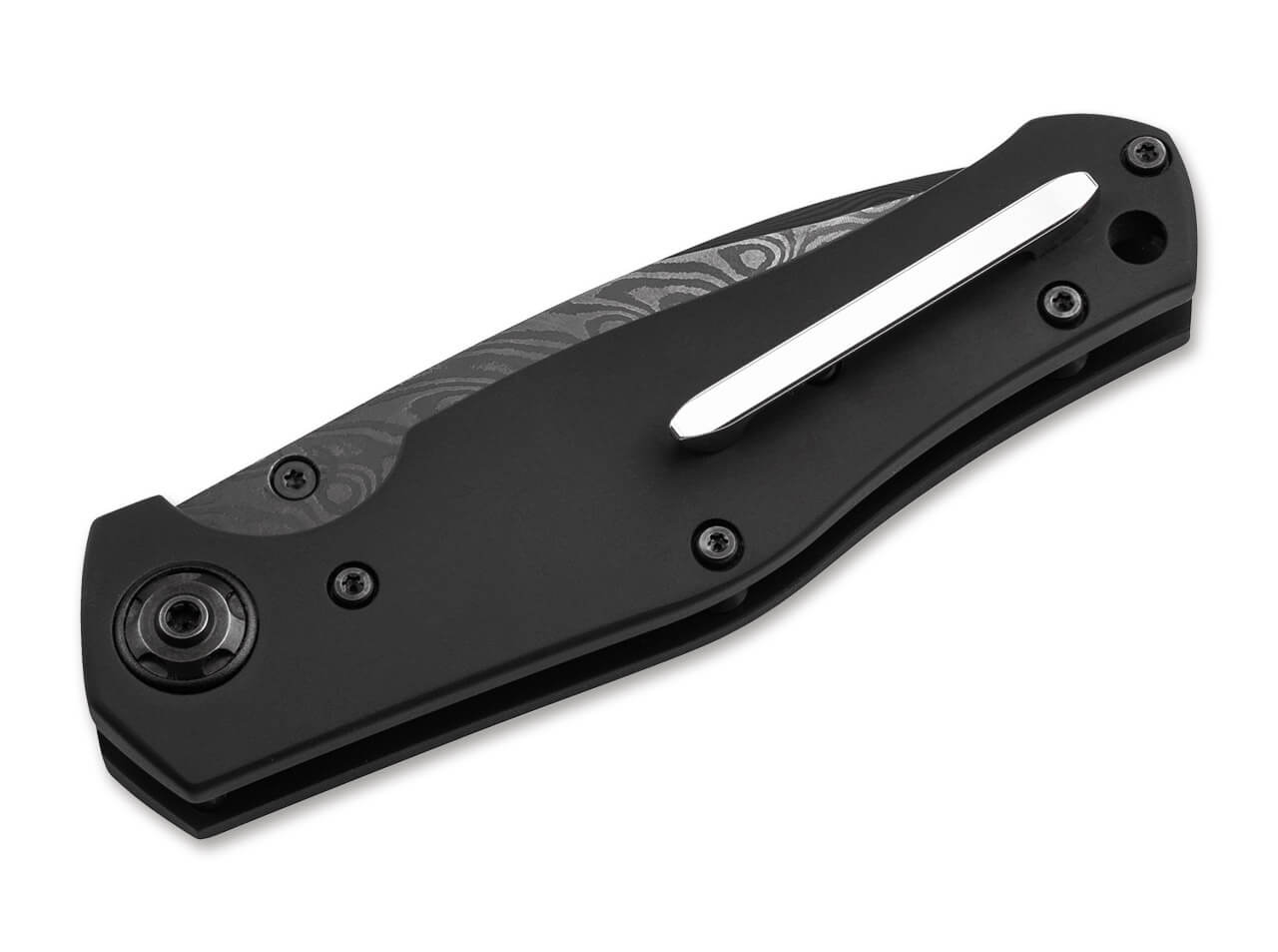 The black hard-anodized aluminum handle interprets the car’s body lines in a progressive design and features striking details: the notchback, small rear spoiler, and gill-like rear fender vents are elegantly integrated into the collector’s knife. The pivot screw echoes the wheels often seen on muscle cars, while the straight, milled stainless steel clip recalls chrome door handles.
