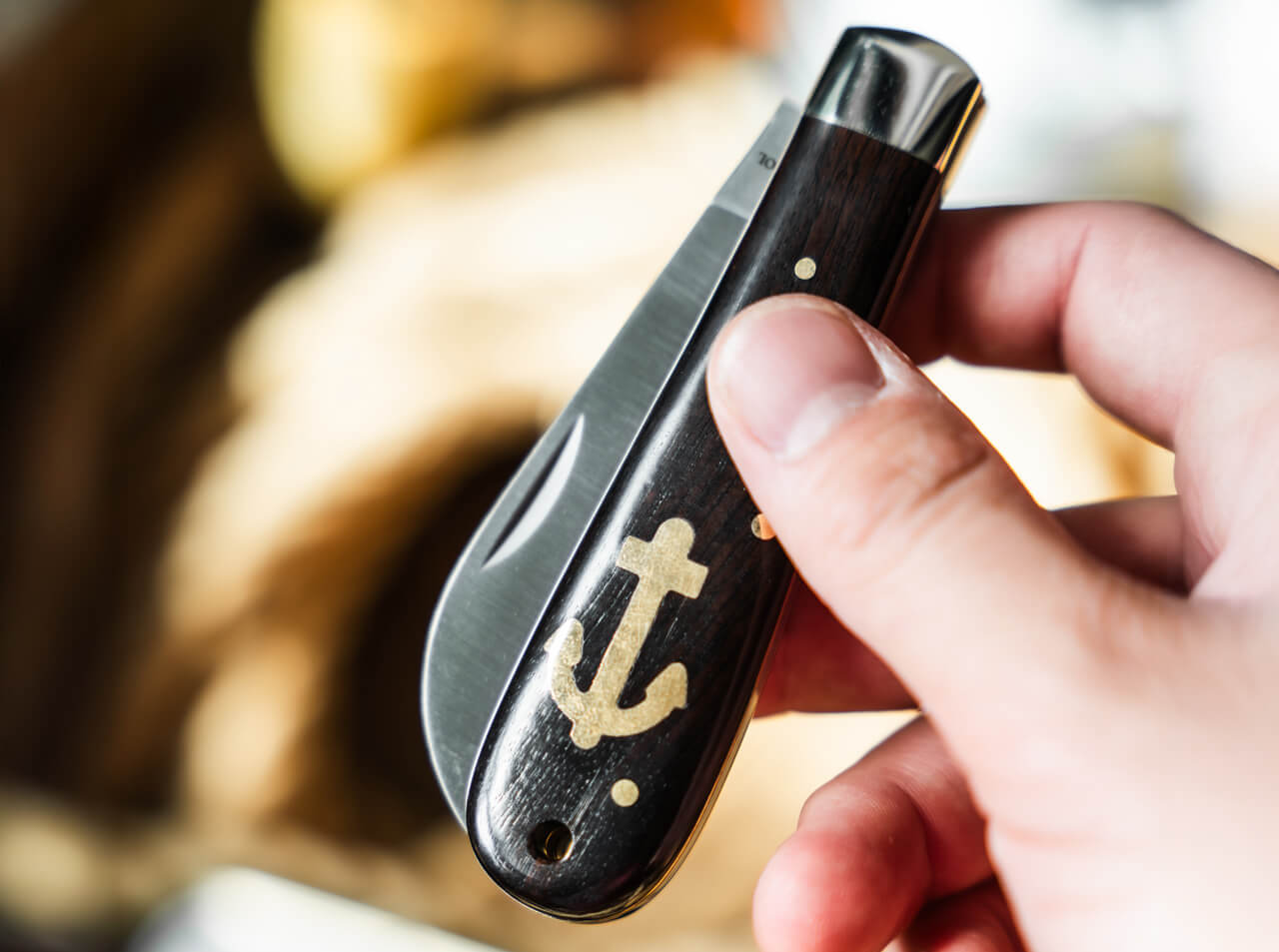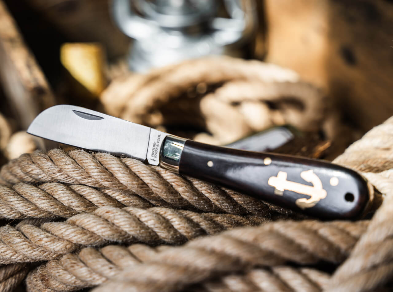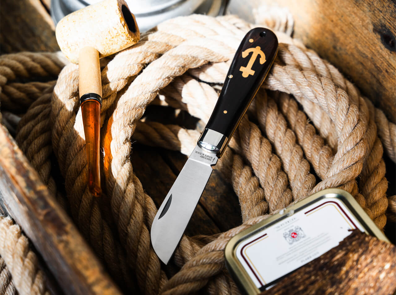 Das History Knife & Tool Ankermesser ist seit dem 19 Jhd. ein internationaler Klassiker der Christlichen Seefahrt und wurde seitdem in Solingen und Thiers produziert. Die französische Bezeichnung dieses Messers „Le London“ legt nahe, dass es dort vor Allem mit der großen Seefahrernation Britannien verbunden wird. Mit großer Wahrscheinlichkeit wurde es auch in Sheffield produziert oder hat dort sogar seinen Ursprung. Alle traditionelle Ankermesser haben als Gemeinsamkeiten einen Griff aus seewasserbeständigem Ebenholz, einen hierin aufwändig eingelegten Anker aus massivem Messing, eine Sheepsfoot-Klinge, die optimiert ist für die Arbeit mit Tauen, eine unkomplizierte Slipjoint-Arretierung und eine angesetzte Stahlbacke. Das History Knife & Tool Ankermesser hat zudem ein praktisches Fangriemenloch, was das Messer bei der Arbeit an Deck vor dem unwiederbringlichen Über-Bord-Gehen bewahrt. Bei neueren Varianten ist die Klinge einsatzgerecht aus rostfreiem Edelstahl gefertigt, beim History Knife & Tool Ankermesser wird der gute alte deutsche Schneidwerkzeugstahl 1.4116 verwendet.