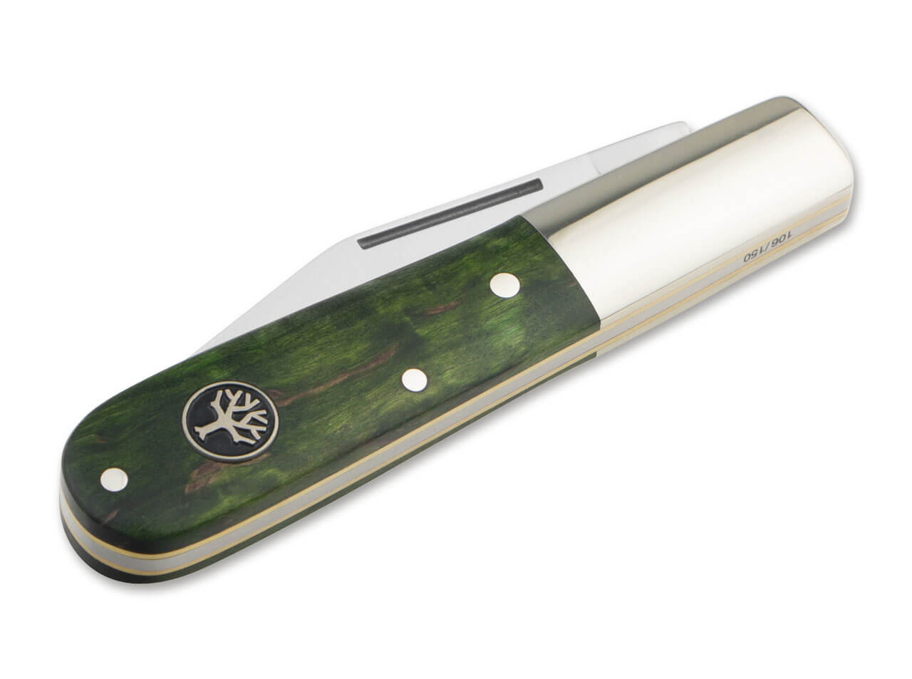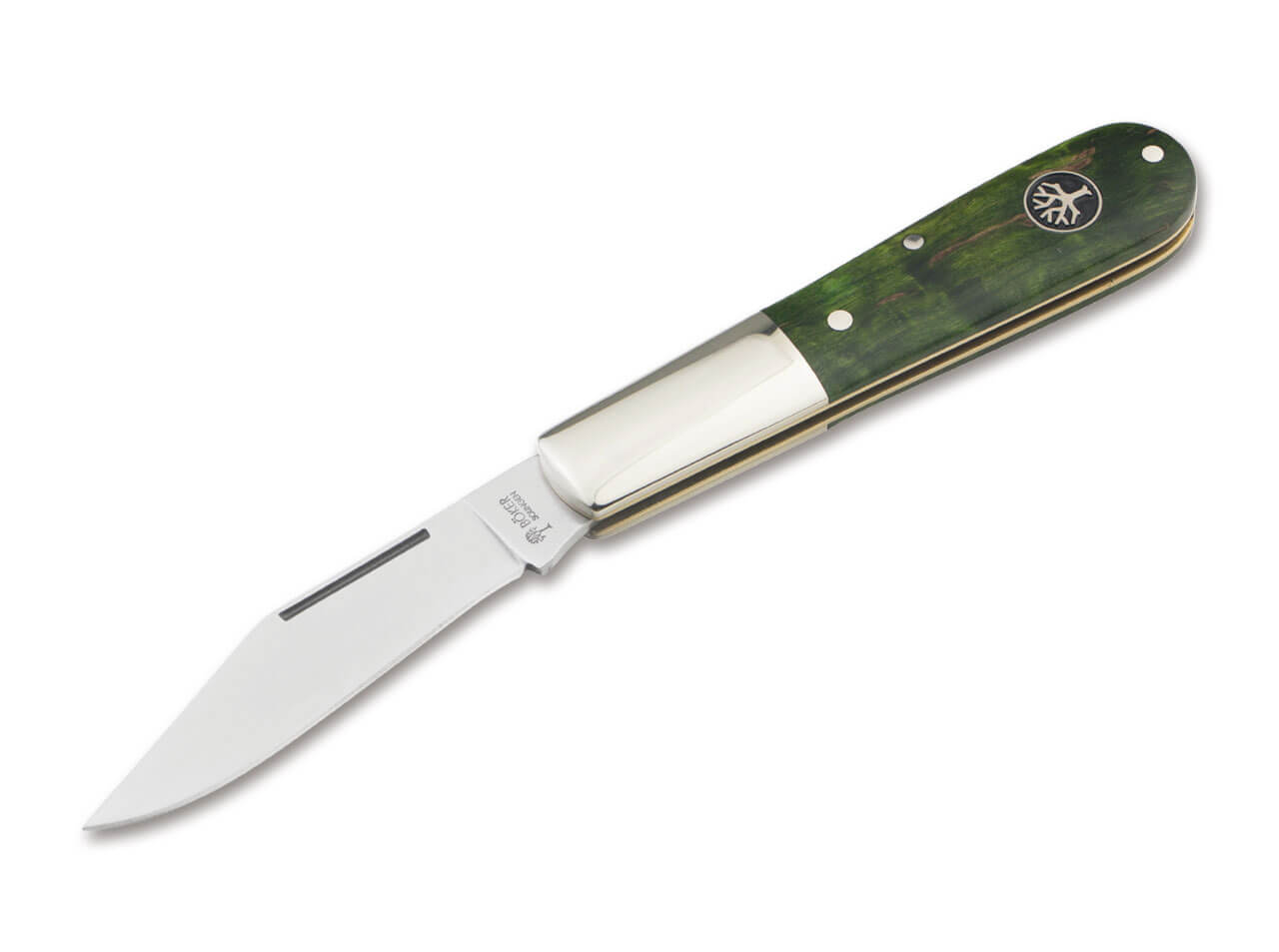 The Boker Barlow with its characteristic extra long bolsters made of nickel silver and the wide blade is a milestone in the model history of the Boker manufactory. The handy knife is absolutely suitable for your trouser pocket, but also big enough to handle most of the cutting jobs of everyday life without any problems. The slipjoint blade is made of 440C and is opened by nail nick. The green stabilised handle scales are made of local burl birch wood, which is characterised by its rich colour and characteristic grain. Handmade in the Boker knife manufactory in Solingen.