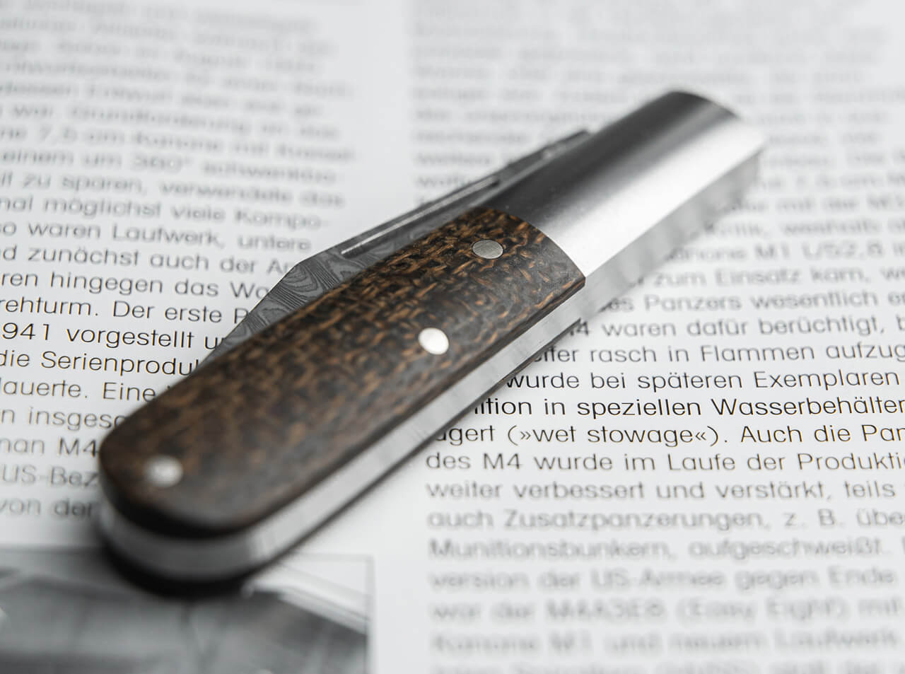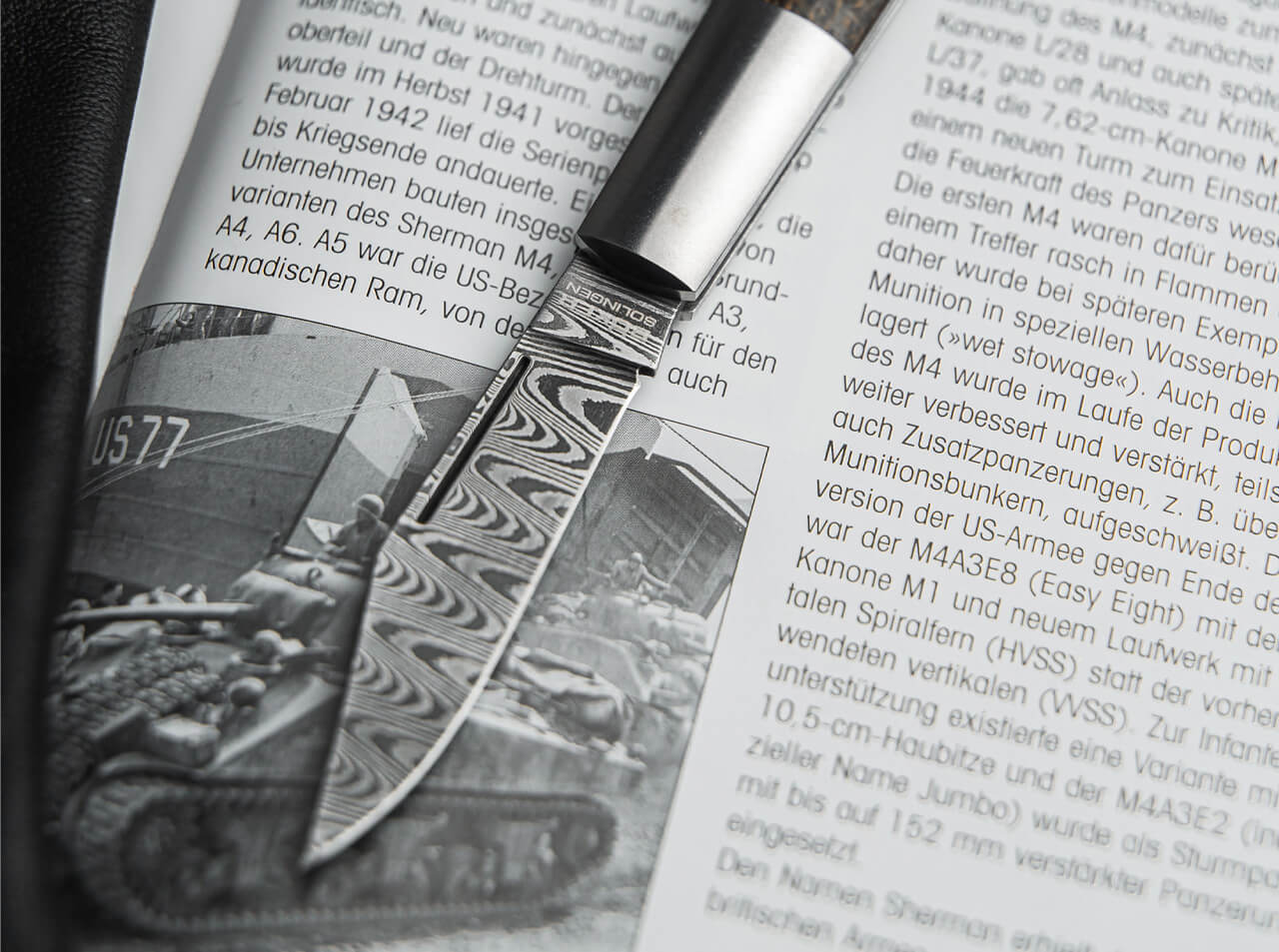 The Boker Barlow M4 Sherman-Damascus is supplied with a unique Damascus blade forged from various materials from the production of M4 Sherman tanks previously restored by the museum. The unique 80-layer Damascus is hand forged for us by Chad Nichols in the customized Ladder pattern and is reminiscent of the tank marks left in the ground by the heavy tracks of the M4 Sherman. The integrally constructed Barlow is supplied with burlap micarta handle scales that are colored to evoke the authentic camouflage finish of the U.S. Army and Marine Corps. The stainless steel handles are CNC-milled from the solid and also form the characteristic bolsters and are ground to a matt finish by hand. Supplied with a high-quality felt case for storage, a certificate of authenticity and an individual serial number. Handmade in the Boker Knife Manufactory in Solingen.