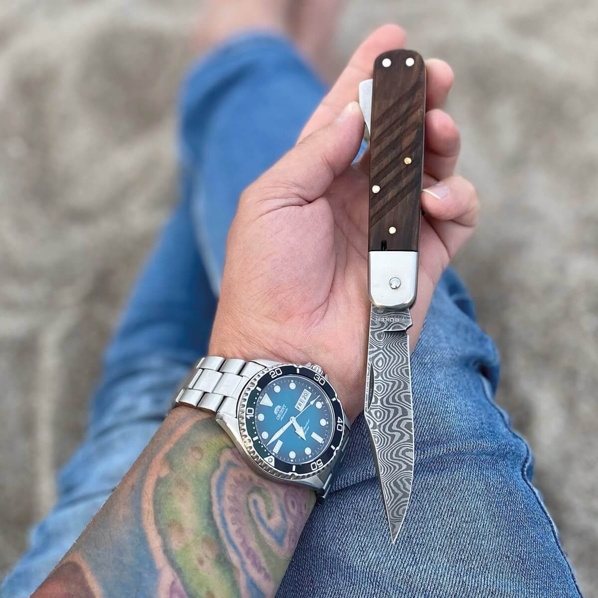 In terms of sheer frequency of use, it should actually be the Boker Vigtig vs Wild, but it's actually the Boker 98K-Damascus from our company. The blade steel carries a lot of eventful history, it is legal to carry, an absolute classic and an eye-catcher at the same time.
