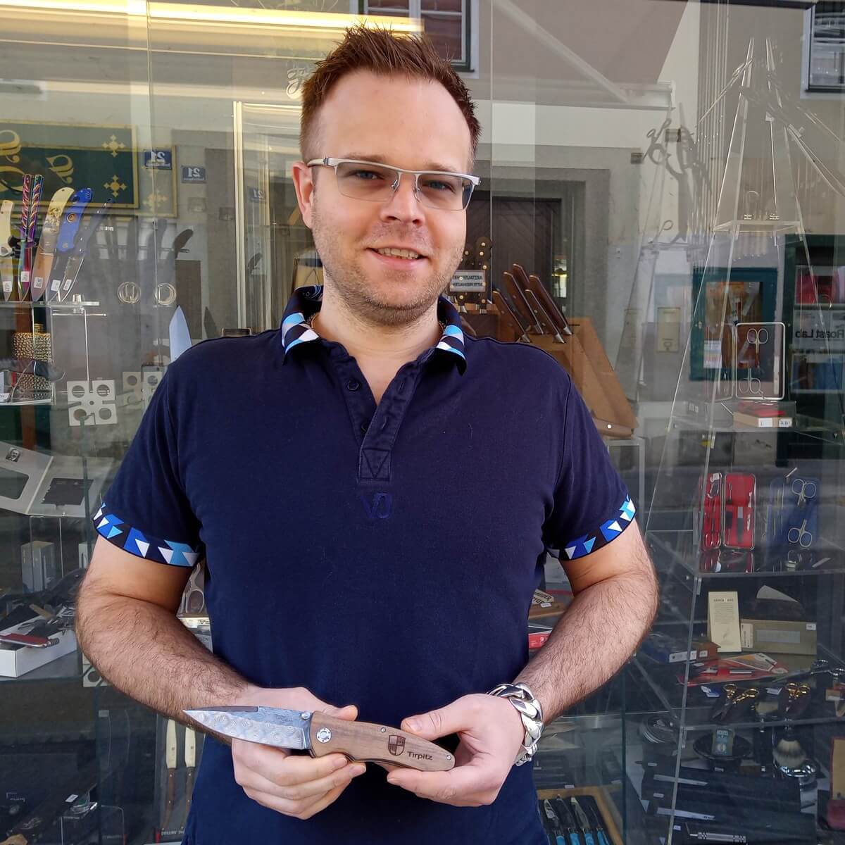 Ingo Kobermeyer's passion for knives was sparked at an early age. He received his first Swiss Army knife from his parents when he was only three years old. The Rambo action movie series continues to shape his enthusiasm for knives. Things are much less racy with his favorite Boker knife. "The Boker Tirpitz-Damast Wood is a superlative knife steeped in history with a Damascus steel blade that looks great to boot. The knife is very well received by my customers, not only as a collector's knife, but also for use." Furthermore, the "feudal Feitl" (Austrian folding knife) impresses with its flawless workmanship.
