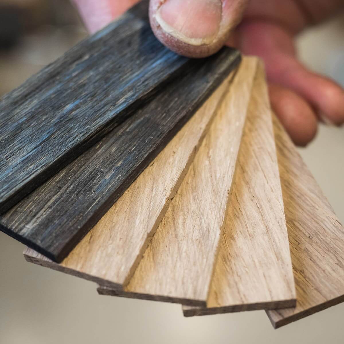 The next step is crafting the historic handle scales. The solid oak beams are one-of-a-kind, hand-tooled in times long gone by. Due to the length variations and countless holes and cutouts for connection pins and wooden nails, processing the handles takes a lot of experience and attention to detail in order to minimize cutoffs and preserve the limited material. First, the wood is cut on a bench saw before they are further processed by hand. In the next step, the squared pieces are turned into delicate wooden scales (approx. 3.5 mm thick) on a table saw. Using a hand-operated miller/grinder, the rough contours of the scales are shaped.