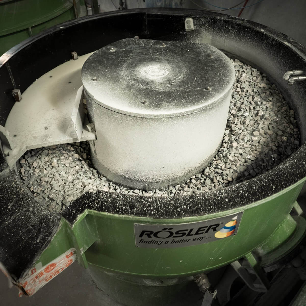 After applying the dark etched layer, the blades are textured with even micro scratches by means of tumbling. In this process, the blades are placed into a tumbler drum with a variety of rocks and „washed“ together. The rocks rub and bump into the blade, creating the desired texture and making the blade more resistant against scratches and traces of wear and tear.