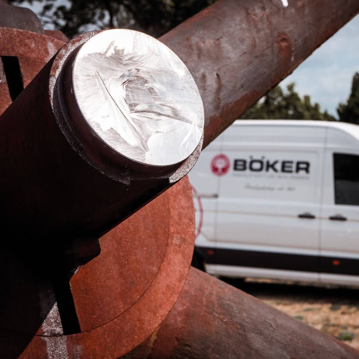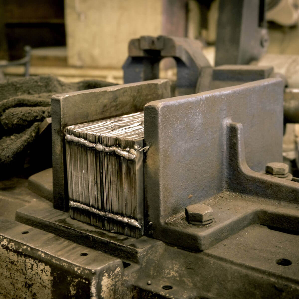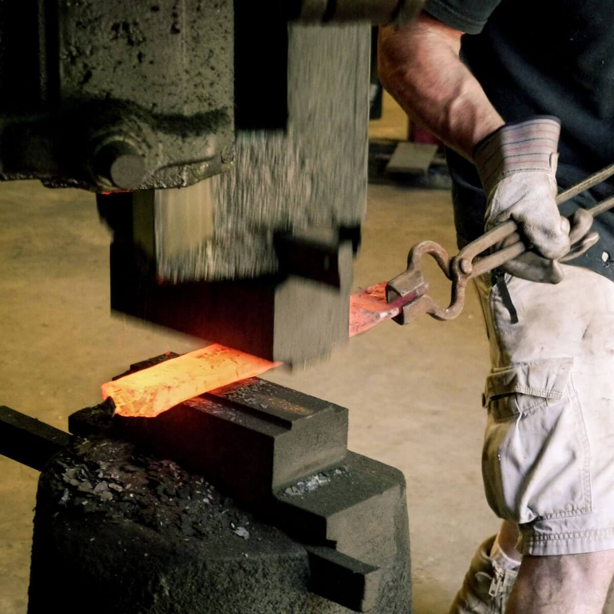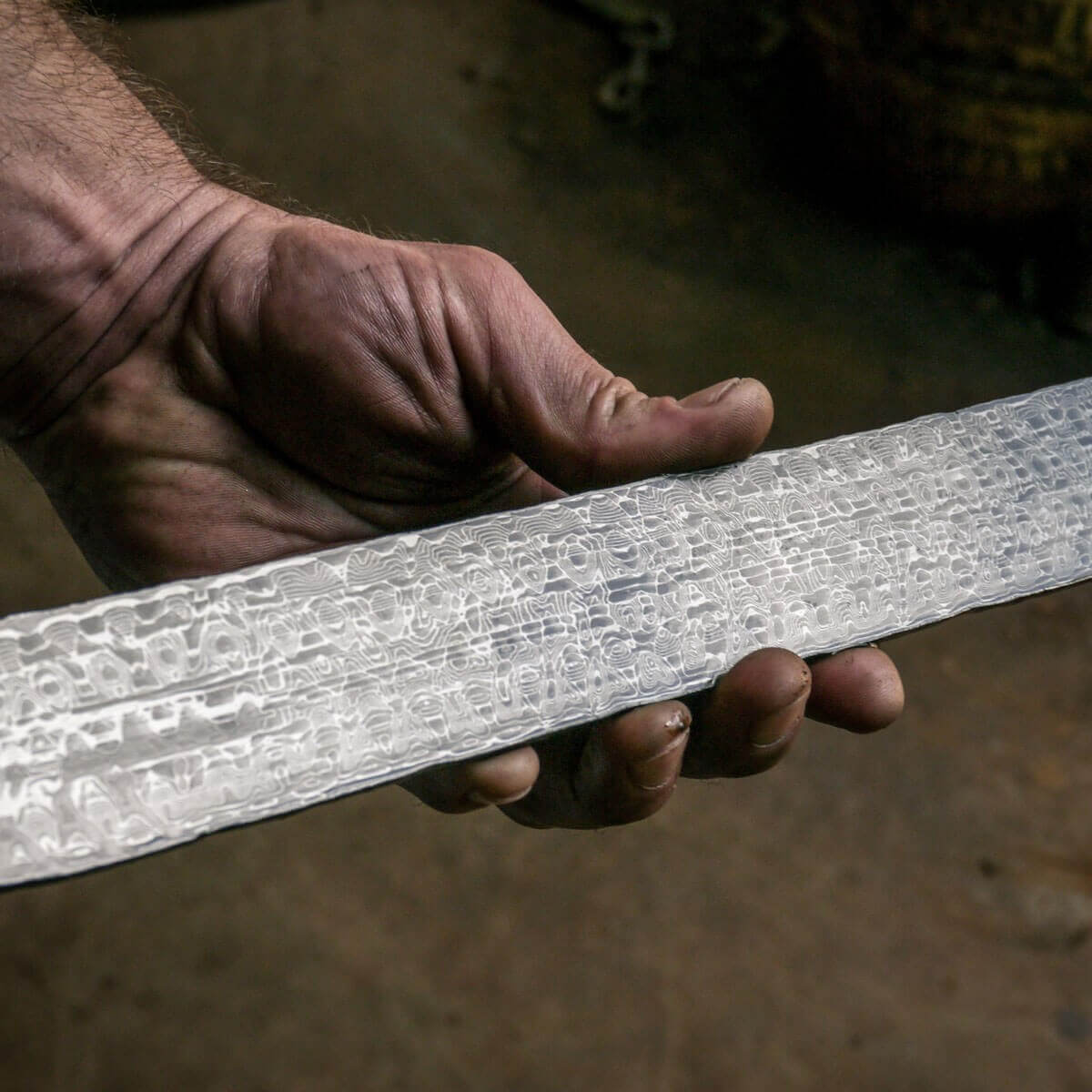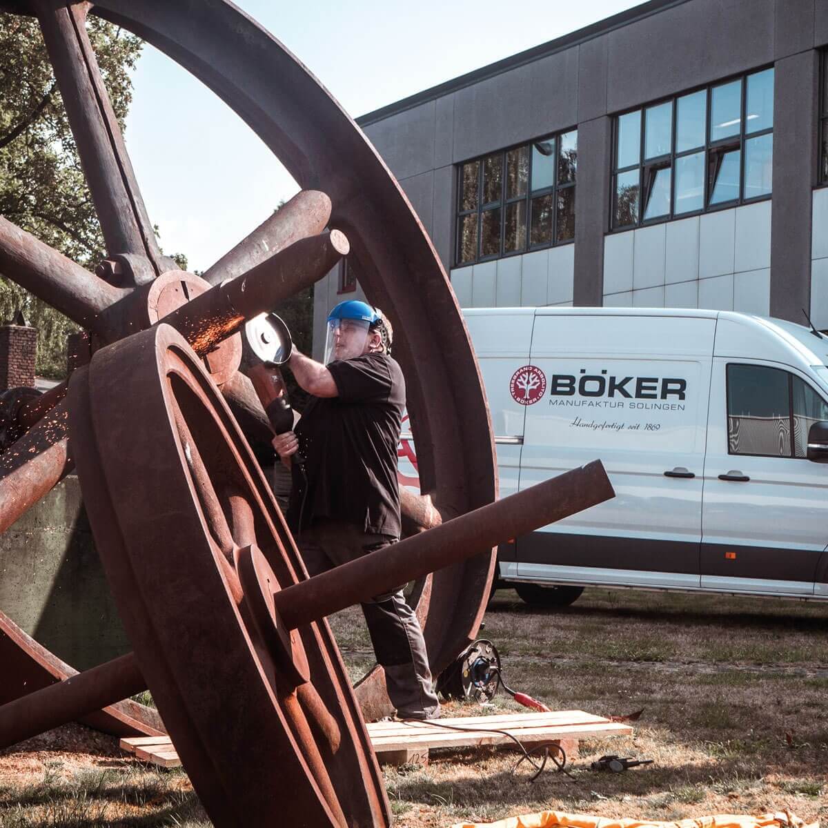 The Damascus blades of these exclusive knives are literally a piece of living history from the Boker manufactory. In the "old days", before electricity became the standard, steam power was the main source of energy for the numerous machines used in manufacturing. This centrally generated steam power was transmitted across the entire manufactory to the individual machines via large flywheels and transmission belts, thus driving the various machines. One of these huge transmission wheels still stands today as a memento on our company premises, keeping alive the memory of the early days of our company and the changes we have undergone over the last century and a half. We have taken a solid piece from the shaft of this transmission wheel and use it to forge the 180-ply damascus steel in the Raindrop pattern, crafted by Chad Nichols for this exclusive anniversary edition.