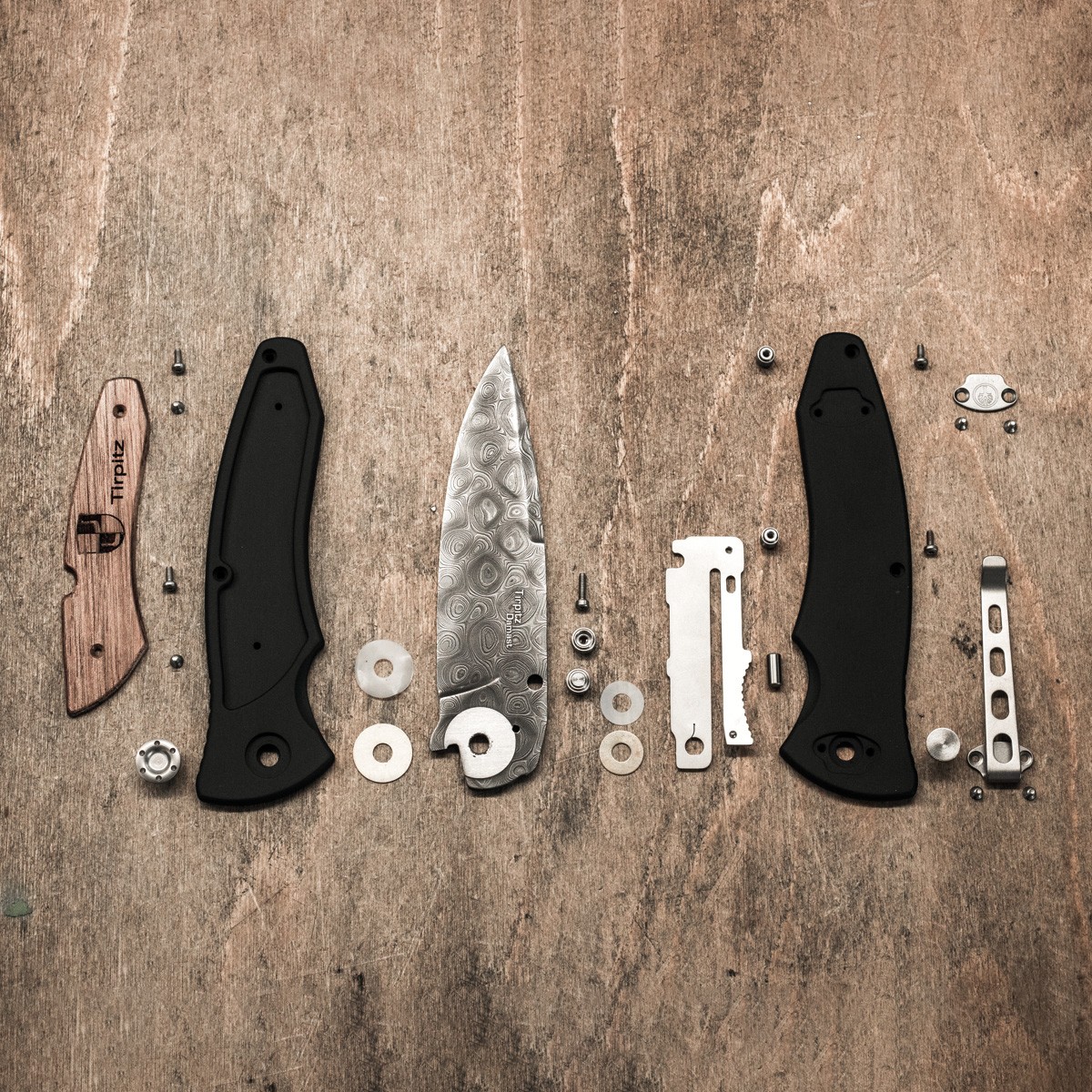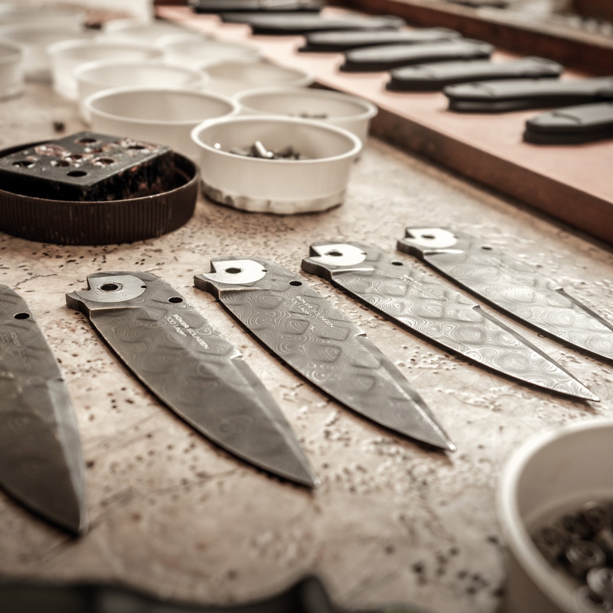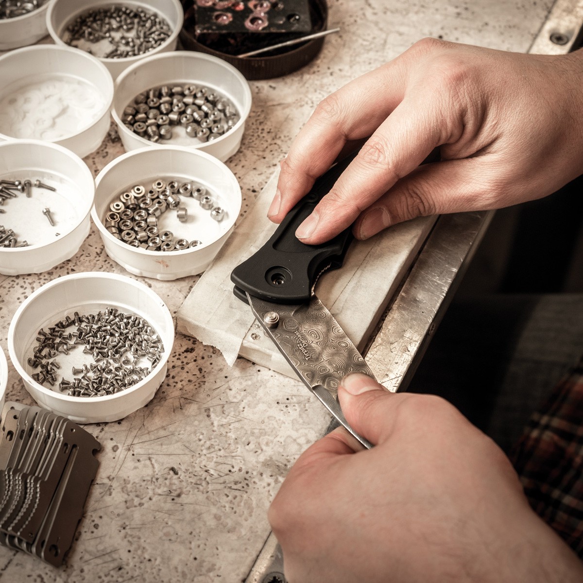 At the same time, the blocking spring is further processed in this workshop. Each part is individually cleaned, deburred and given a uniform finish while sitting on the bench. This is the only way to ensure that the springs function perfectly. Each individual blade also passes through the hand padding process. For an even surface without stains, the blades are first carefully cleaned and polished by hand. The beautiful and exclusive Damascus pattern is only then made visible by a special etching technique, in which the Damascus blades are individually dipped in an acid bath. Since the steel alloys used react differently to the precisely coordinated acid treatment, the Damascus pattern is now visible. Each blade of the Tirpitz-Damascus is also provided with a model-specific lettering. In order to place this on the Damascus blade, the letters are applied with an acid-resistant print before deep etching. After etching, the print is carefully removed so that the desired lettering breaks the fine Damascus pattern cleanly.