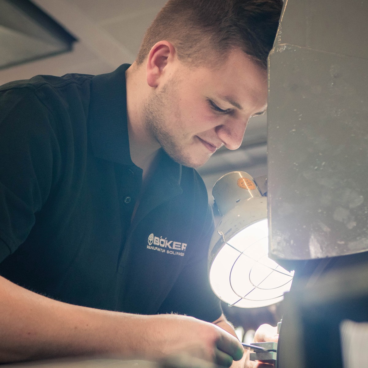 In the grinding shop, the bevel, i.e. the long phase from the back to the cutting edge, is applied. For this, the blade blanks are placed individually by hand on the blade-specific device. Particular care must be taken when cooling the workpieces, as the blades could warp as a result of the heat input.