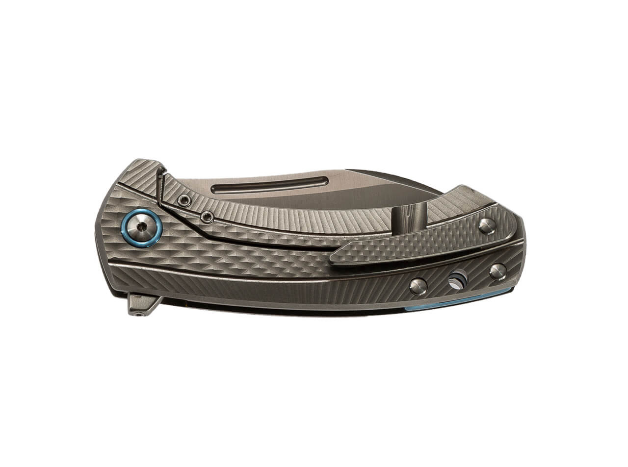 The curved handle has a front scale of modern carbon fiber and features the characteristic milled design. The blade on ball bearings consists of Böhler M390 and is easy to open with the removable flipper or the striking nail nick. A satinized finish completes the blade design. The blade is secured by a sturdy framelock made from solid titanium. The spacer and clip consist of the same material.