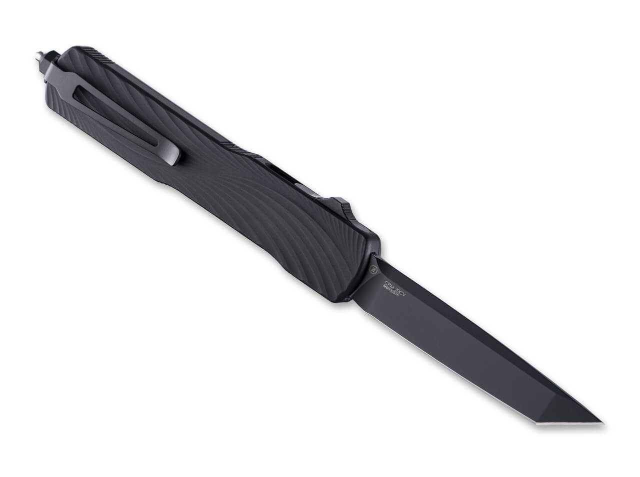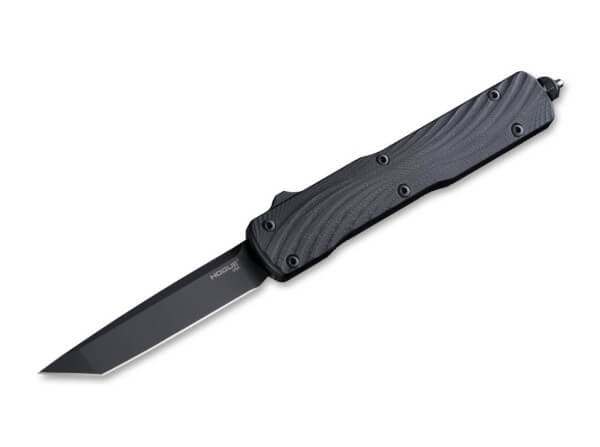 Where other knives give up when faced with adverse cutting conditions, the elegant Hogue Counterstrike strikes back. The slim OTF (Out The Front) knife opens and closes the black-coated tanto blade made of powder-metallurgical CPM-20CV as quick as an arrow via a slider on the back of the handle. The 6061-T6 aluminum handle with black G10 scales ensures maximum stability and the best possible grip. With reversible tip-down clip and carbide glass breaker with integrated lanyard hole.