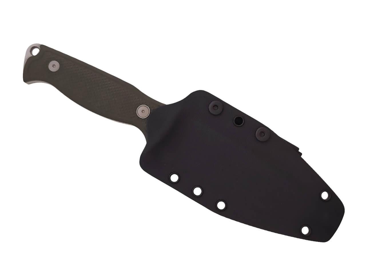 Ergonomic handle scales made from green G10 ensure a secure grip, while the included Kydex sheath allows safe carry and quick access.
