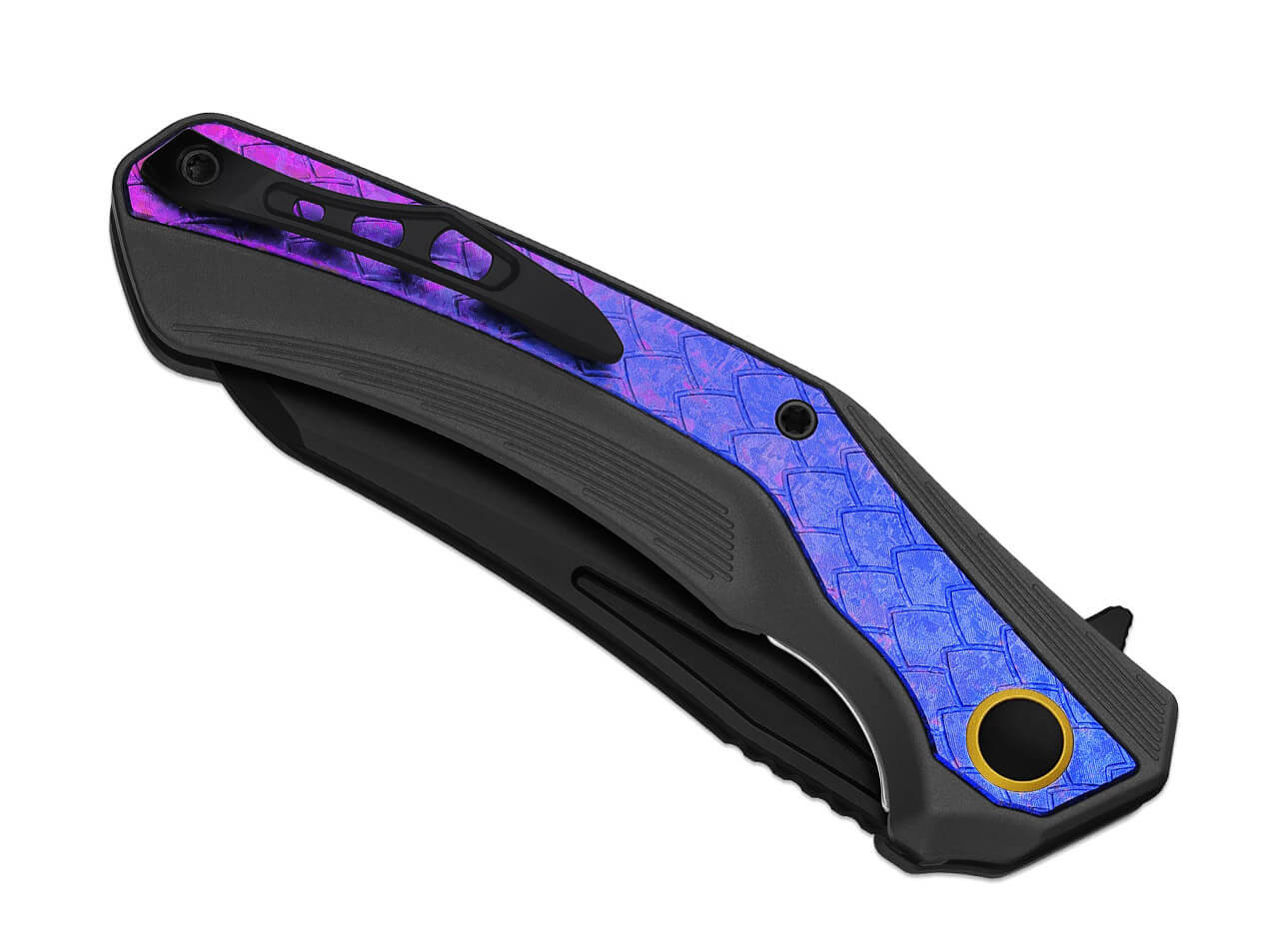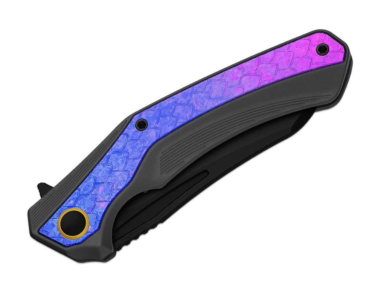 The handle combines aluminum and crystallized titanium, creating a unique appearance with shimmering blue and purple tones.