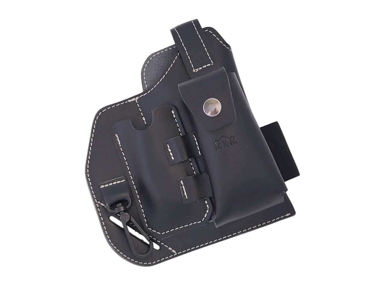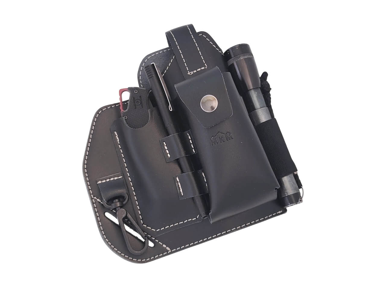 The EDC Belt Organizer Leather Sheath Black is a durable leather pouch designed to organize and carry your everyday essentials. Made from black leather, it holds items such as a pocket knife, flashlight, pen, and other compact tools.