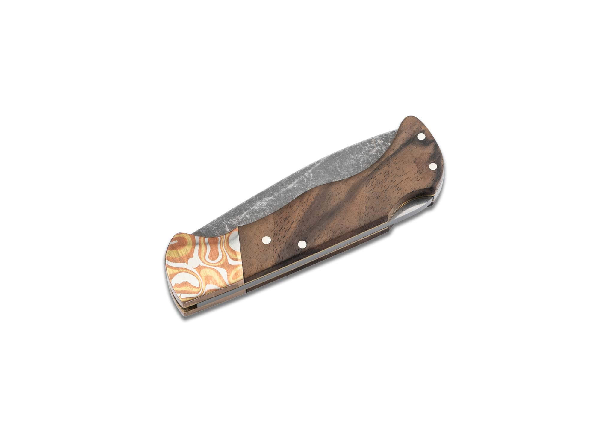 In this extraordinary version the timeless Boker Folding Hunter Mokume is equipped with a 440C blade, which has a powerful black stonewash finish. The bolsters of the elegant pocket-knife, on the other hand, are handcrafted by Chad Nichols according to an old Japanese model from Mokume, a combination of different non-ferrous metals that are partially amalgamated and forged together in a complex process to create a Damascus-like pattern. The handle scales made of local walnut complete the elegant appearance, while a reliable back-lock ensures the secure locking of the blade. The double-handed knife is delivered in a high-quality felt case. Handmade in the Boker Manufactory in Solingen.
