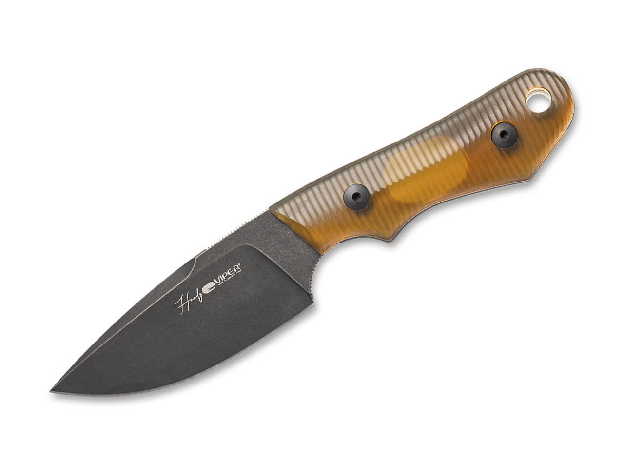 The Viper Handy Dark from Fabrizio Silvestrelli proves that a fixed blade knife doesn't have to be anything but bulky. Made for demanding cutting tasks, the handy knife glides almost effortlessly through cardboard boxes or packaging thanks to its powerful, black-coated blade made of powder metallurgical MagnaCut. Full tang construction, jimpings on the thumb rest and the ergonomic handle scales made of amber-colored Ultem provide the necessary stability and work safety. A ricasso on the back of the blade rounds off the dynamic character of the driving knife. With lanyard hole and high-quality Kydex sheath.
