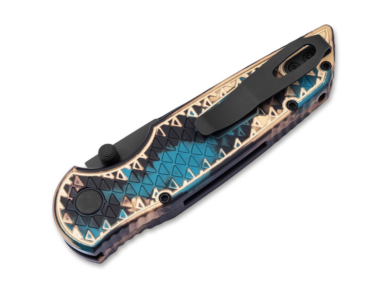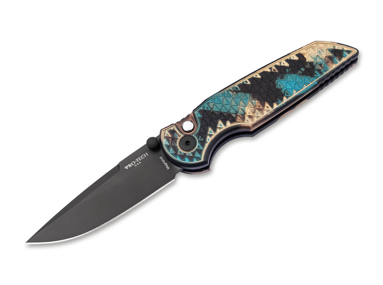 The Pro-Tech Integrity INT1106-SHIPWRECK is a distinctive tactical folding knife that blends premium materials with an eye-catching and artistic handle finish. The unique Shipwreck anodization creates a striking blue, brown, and black pattern on the handle, reminiscent of naturally oxidized metal, giving each knife an individual appearance and collectible character.