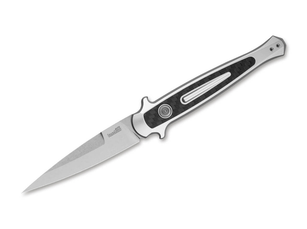 Inspired by the classic charm of Italian stilettos, the Kershaw Launch 8 reinterprets this traditional design. The automatic knife picks up on the symmetrical lines of a stiletto and is easy to carry. The slim blade made of powder metallurgy CPM-154 is ground on one side and has an eye-catching ricasso at the back of the blade to save weight while emphasising the stiletto style. To maintain symmetry, the pivot point is recessed deep into the handle and covered by a carbon fibre insert. Integrated finger guards on the top and bottom of the carbon fibre and aluminium handle prevent fingers from being put in danger. With convertible pocket clip (tip-up).