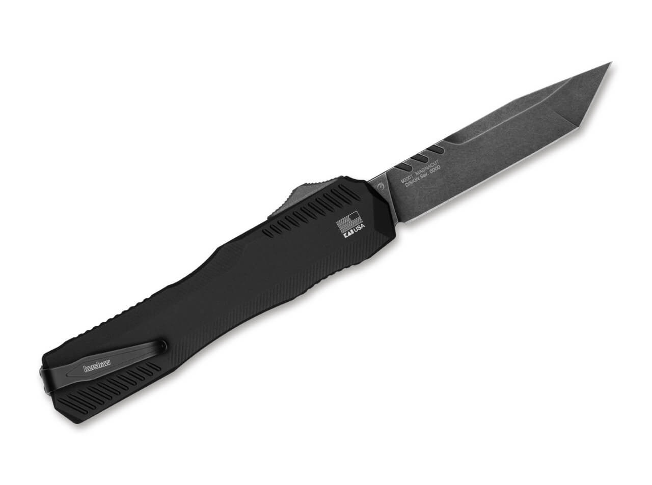 Kershaw and designer Matt Diskin join forces for the expressive Livewire. This version features a black anodized aluminum handle and a black stonewashed tanto blade made of CPM MagnaCut steel, which stands for high edge retention and durability. The OTF knife's curved, step-shaped knob sits comfortably in the hand and ensures reliable triggering. Thanks to its low weight and the reversible deep-carry clip (tip-up), this knife is also very easy to carry. Made in the USA.