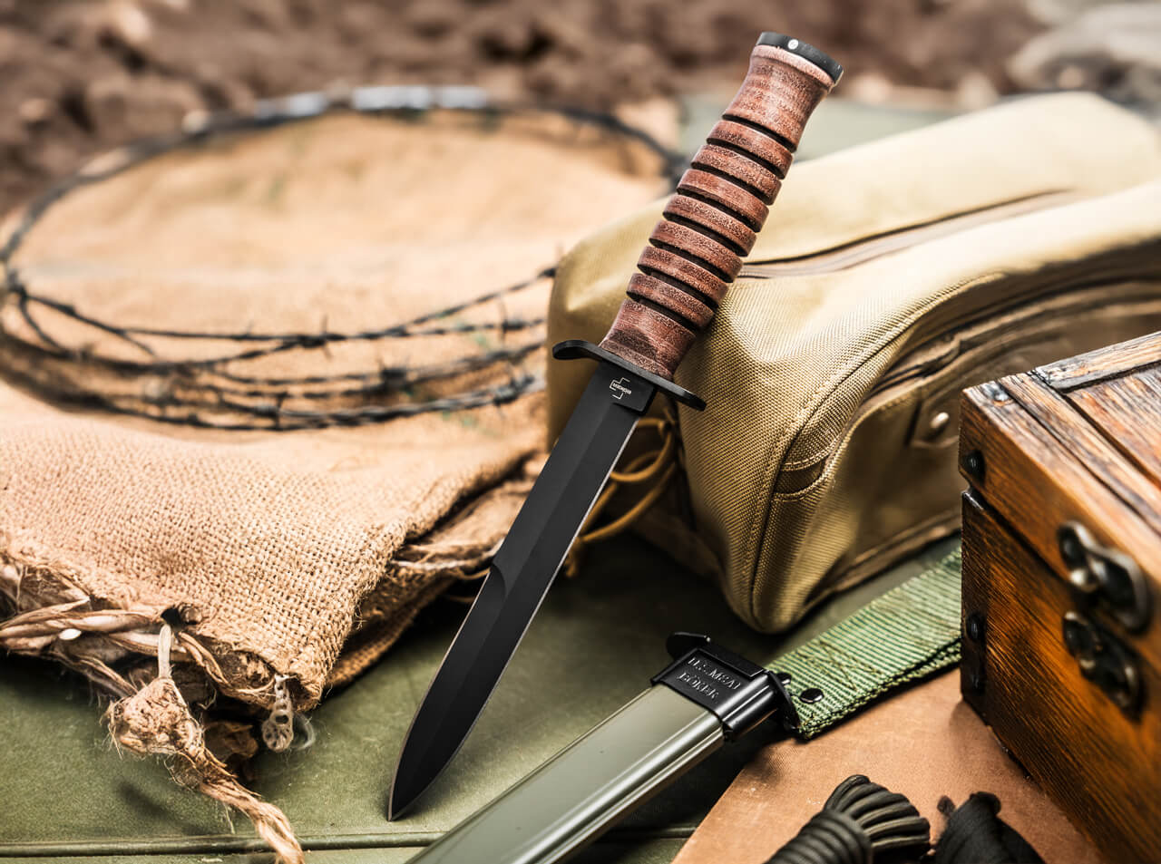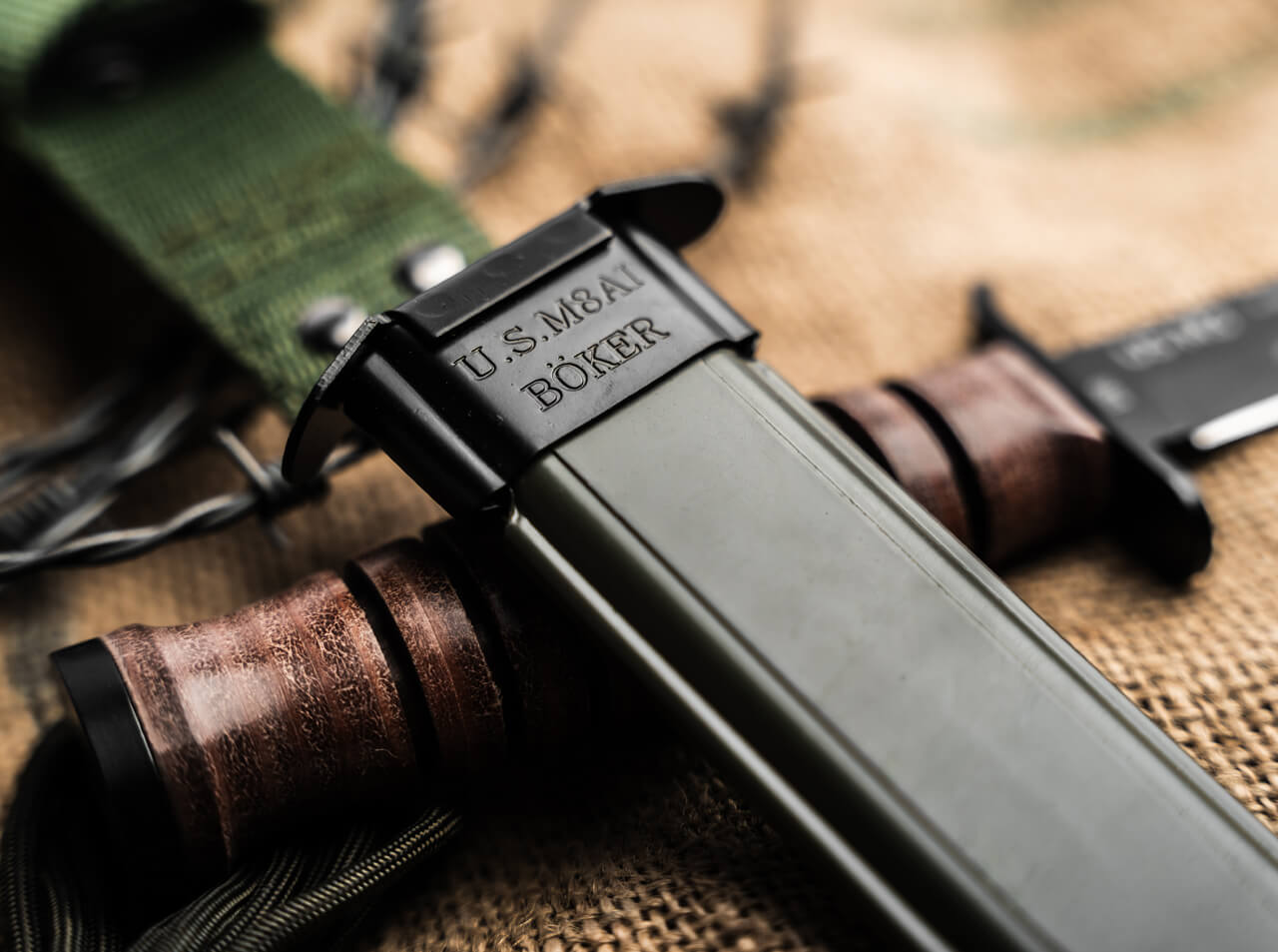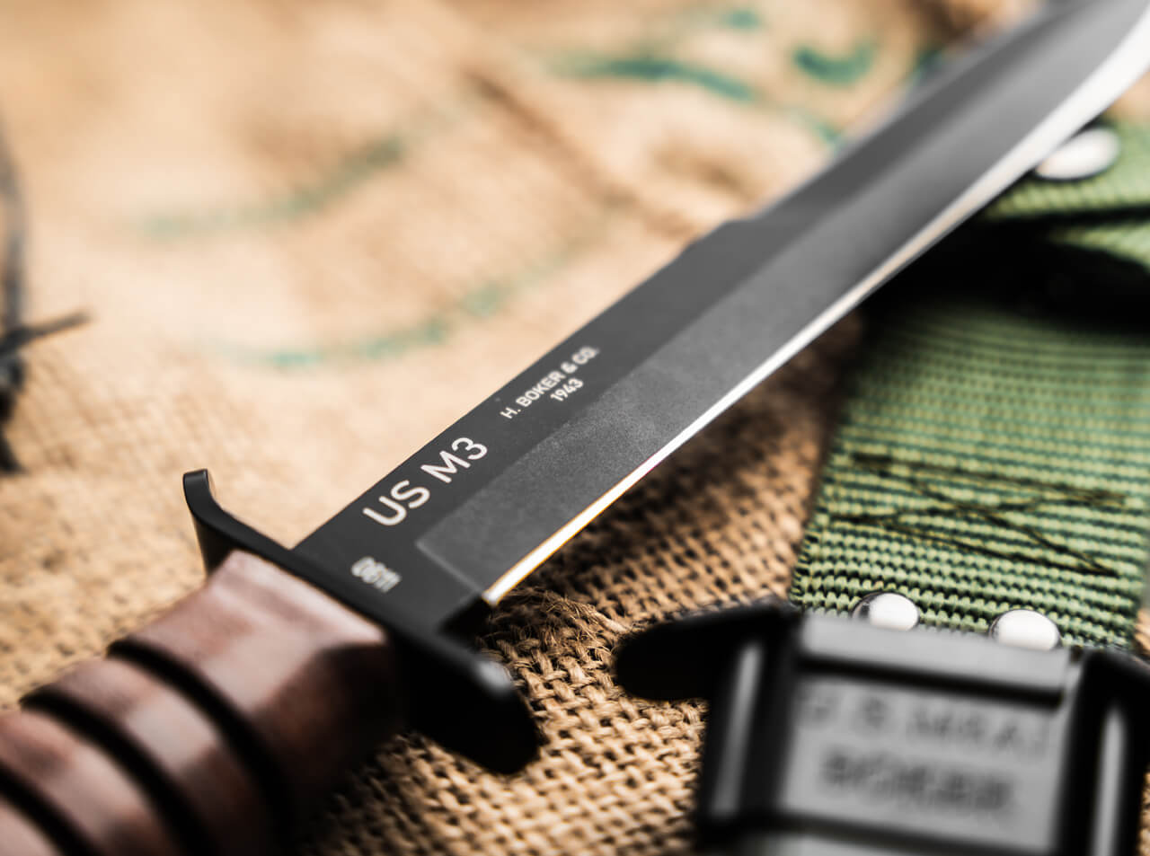 The Boker M3 Trench Knife revives this classic piece of American military history, combining the historic design with high-quality materials and perfect workmanship. The black coated blade is made of the non-stainless carbon steel 1095 and is marked with the original "H. Boker & Co." blade stamp from 1943. The handle is made of pressed leather rings and always fits securely in the hand, even in wet and humid conditions. The characteristic parry element prevents unintentional slipping onto the blade. The ricasso in the back of the blade not only reduces the weight and perfects the balance of the knife, but also emphasizes the clean lines. With authentic U.S. M8A1 sheath and individual serial number.
