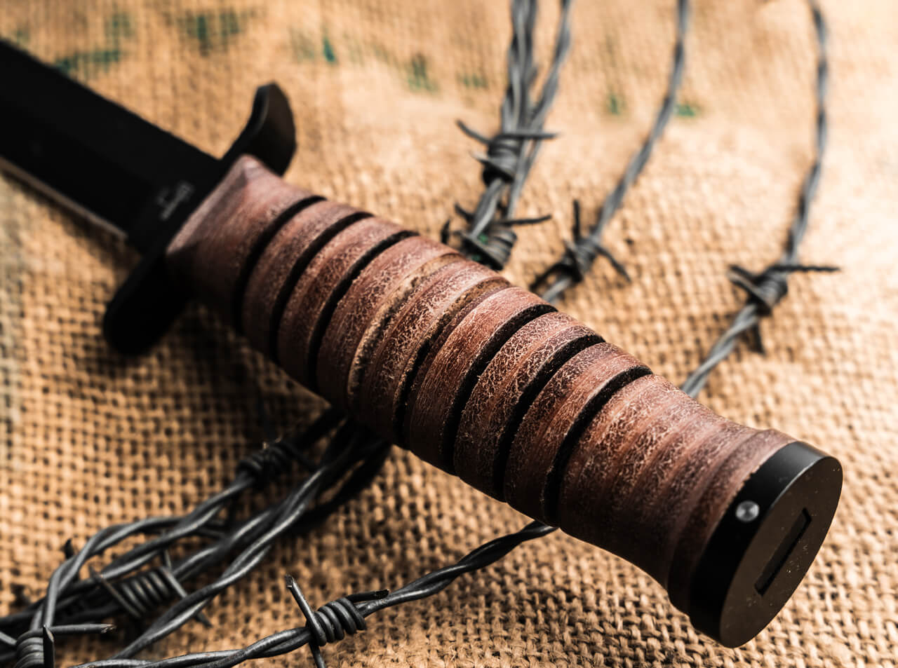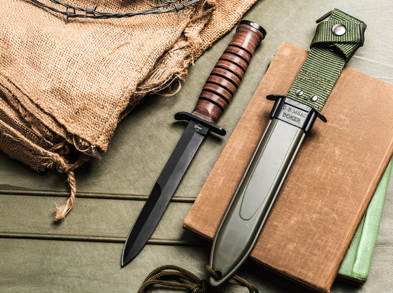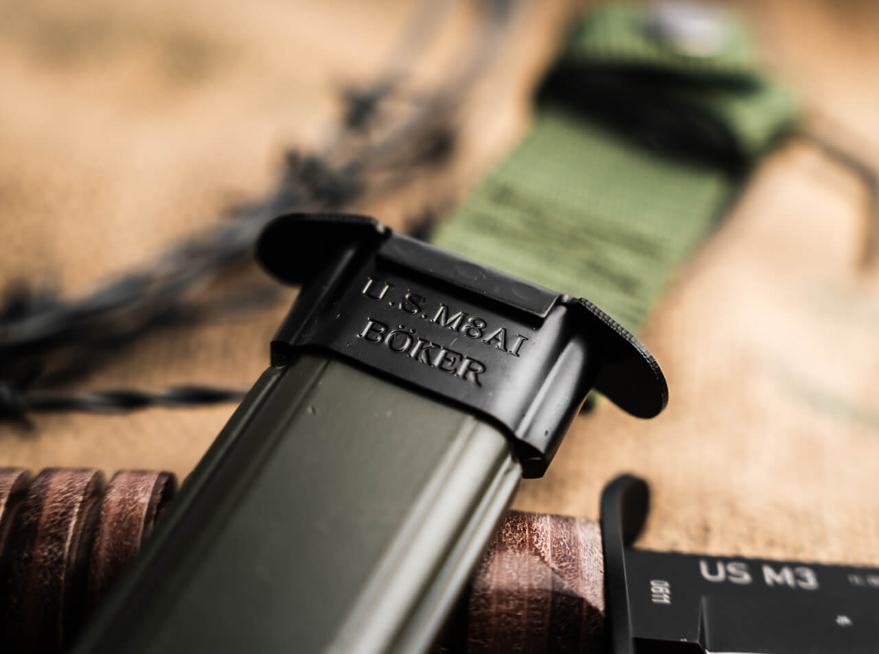 The Boker M3 Trench Knife revives this classic piece of American military history, combining the historic design with high-quality materials and perfect workmanship. The black coated blade is made of the non-stainless carbon steel 1095 and is marked with the original "H. Boker & Co." blade stamp from 1943. The handle is made of pressed leather rings and always fits securely in the hand, even in wet and humid conditions. The characteristic parry element prevents unintentional slipping onto the blade. The ricasso in the back of the blade not only reduces the weight and perfects the balance of the knife, but also emphasizes the clean lines. With authentic U.S. M8A1 sheath and individual serial number.