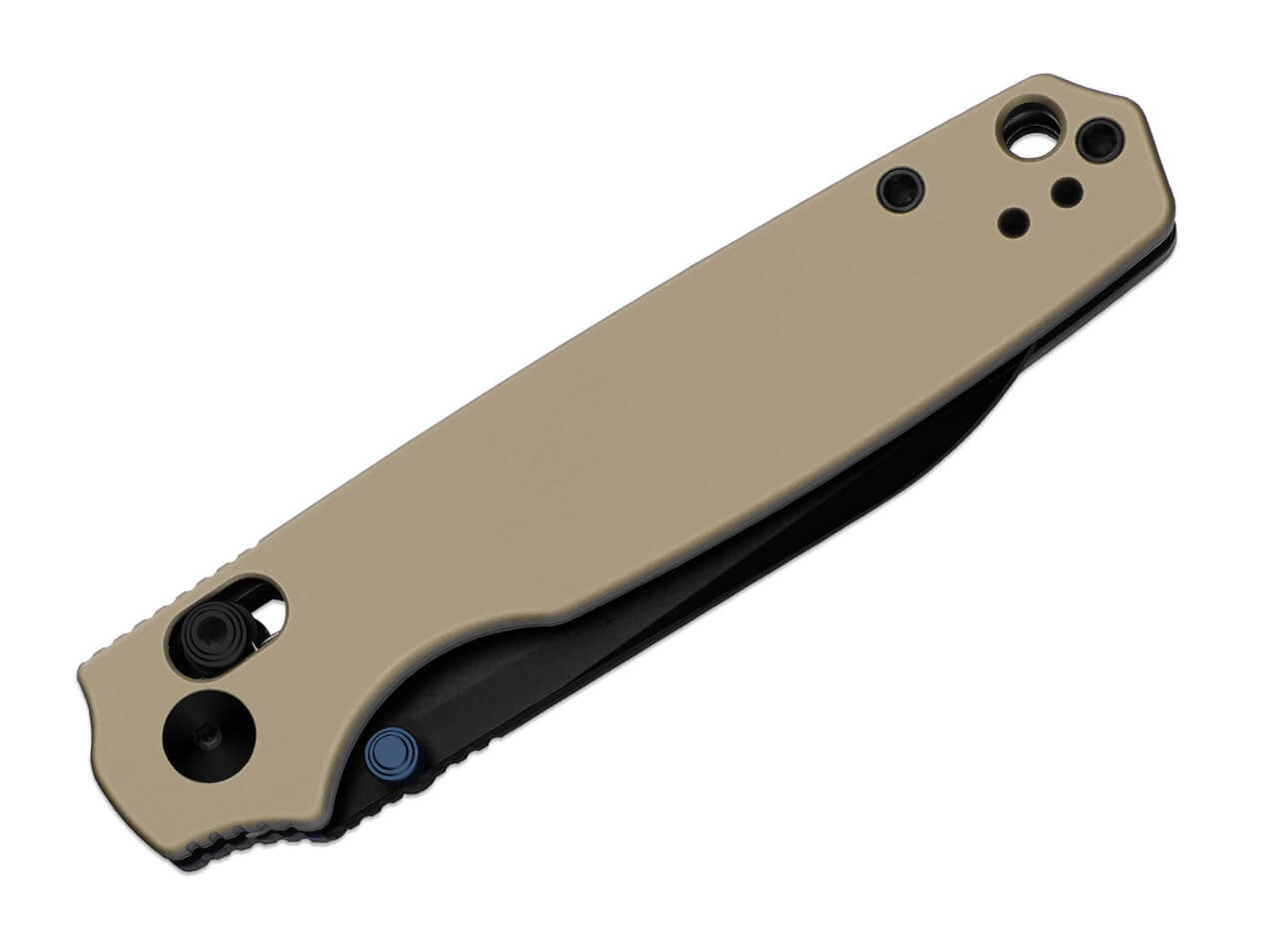 The tan brown aluminum handle ensures a secure grip and precise handling. A reversible Tip-Up clip allows flexible carry on a belt or in a pocket, while the Clutch Lock provides reliable blade stability during cutting tasks.