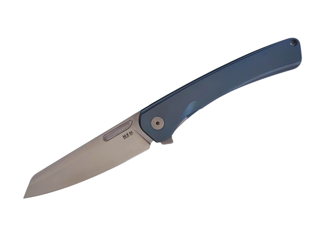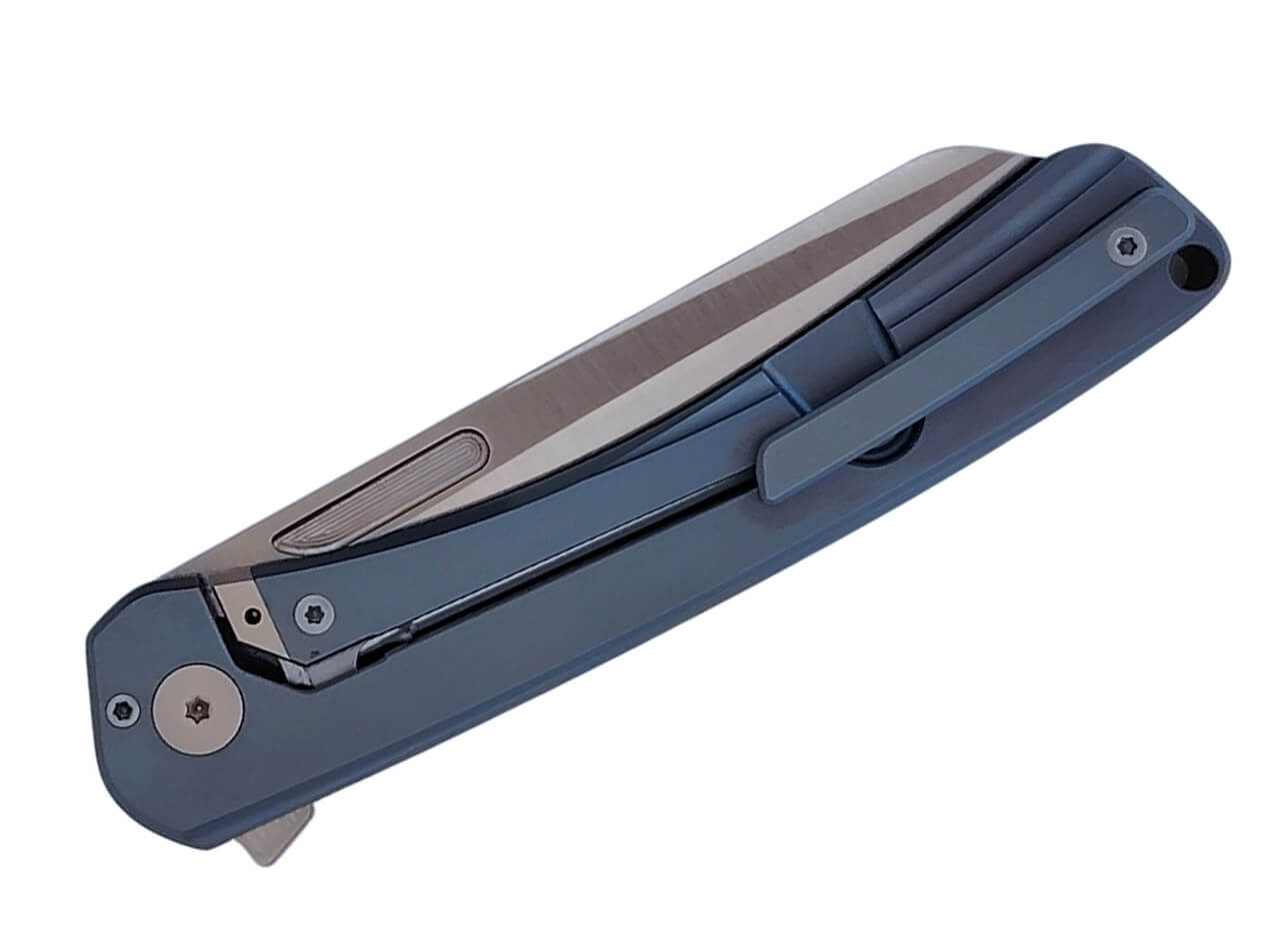 A smooth flipper opening and secure frame lock ensure reliable operation. The blue titanium handle combines lightweight strength with a premium feel.