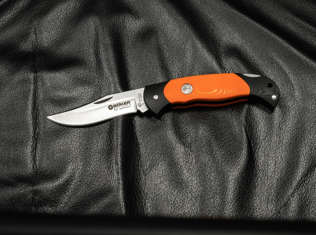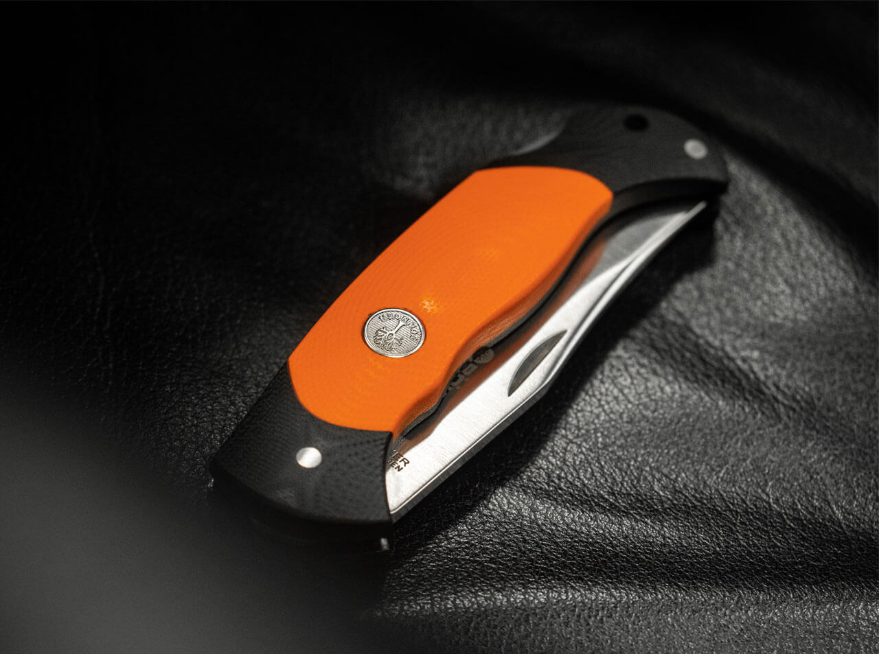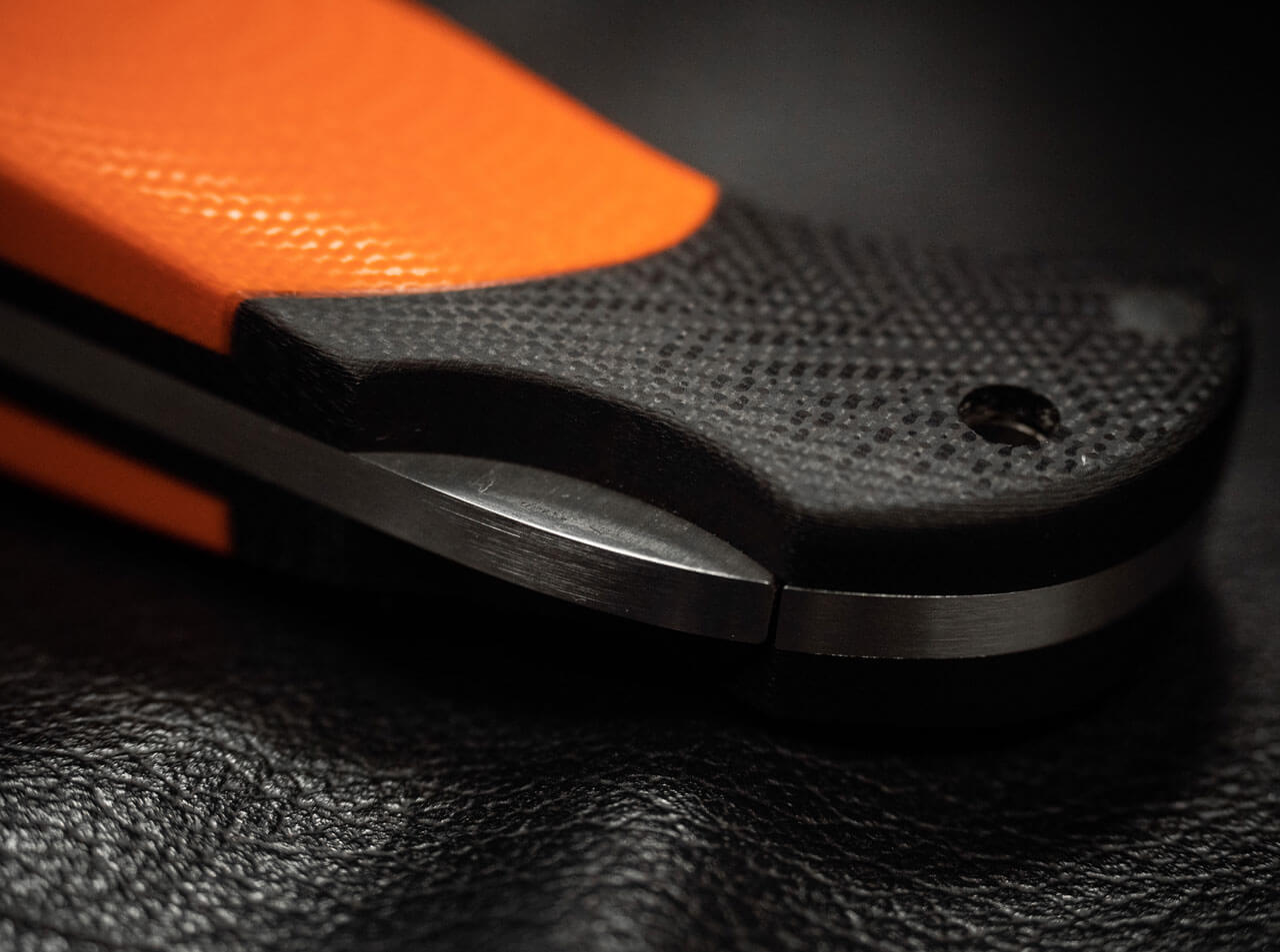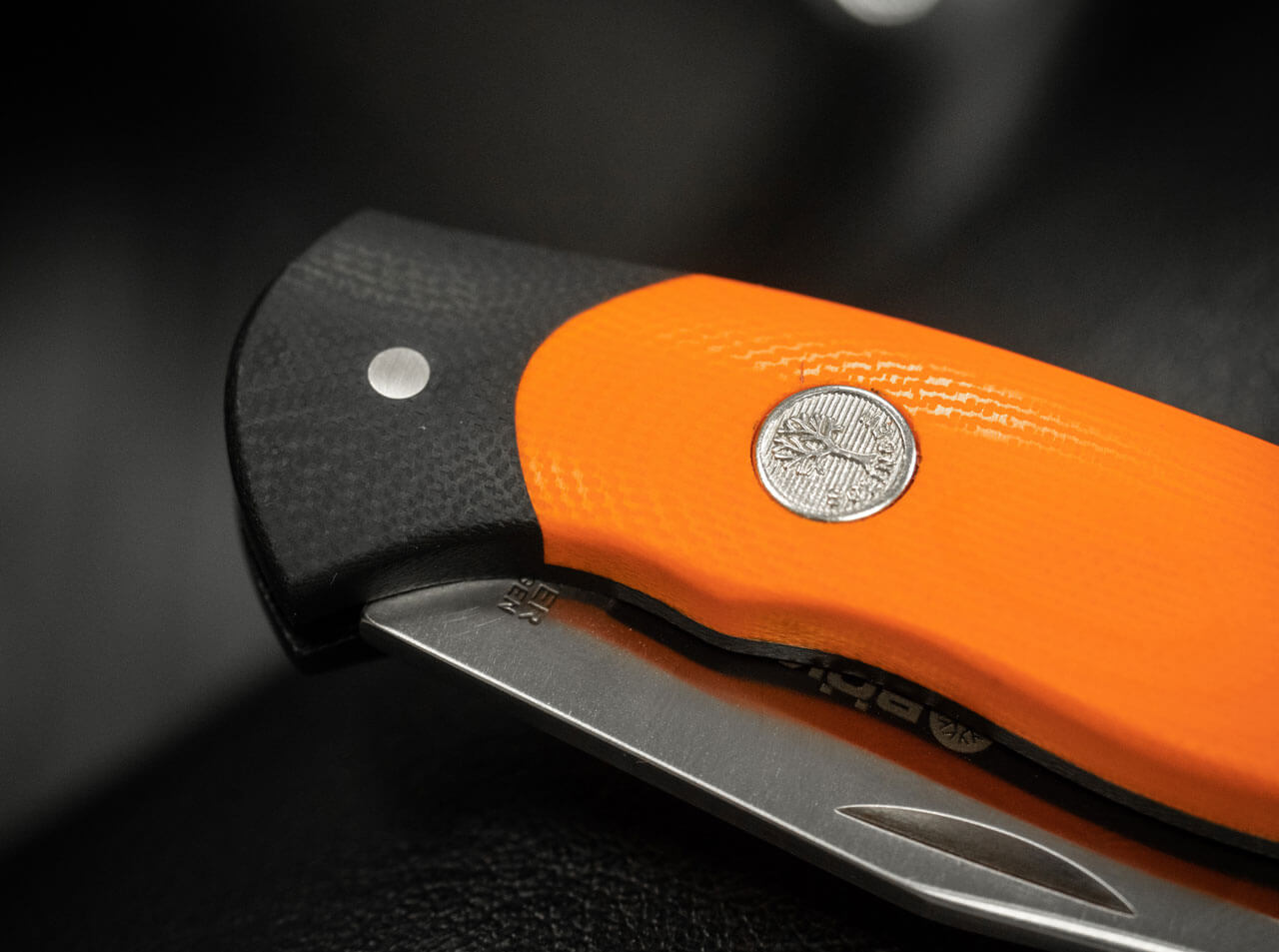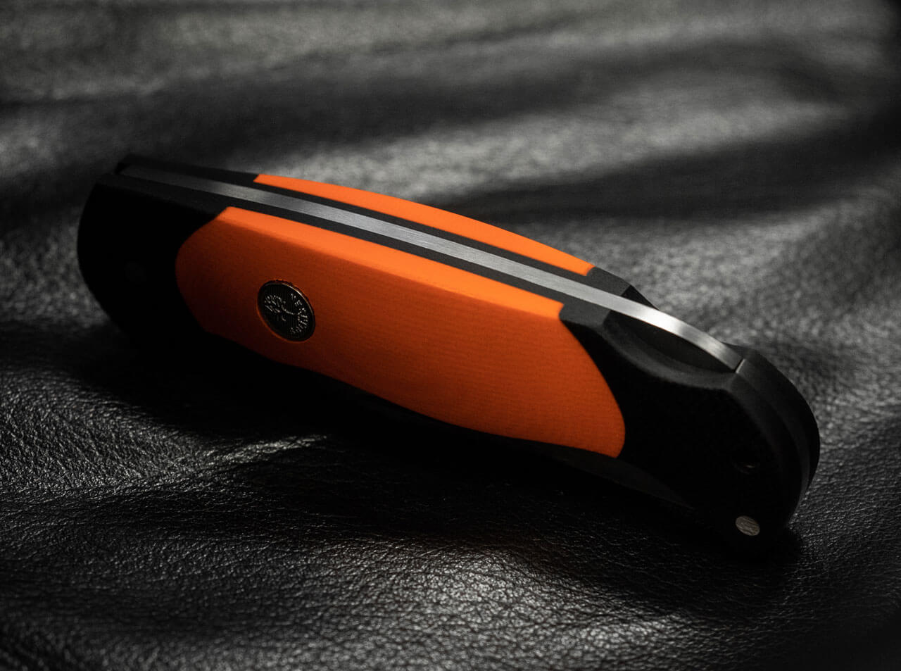 Following several versions with wooden scales, we are now presenting a version with a G10 body and inserts made from contrasting colorful G10 as well. The G10 material offers best possible strength and resistance to environmental conditions such as moisture. The striking orange color creates a beautiful contrast and makes the knife easy to find.