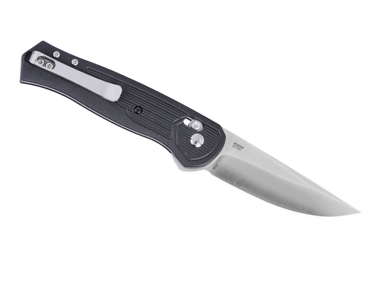 The Crossbar Lock ensures a reliable locking mechanism, allowing the blade to be easily opened and closed with one hand, suitable for both right- and left-handed users. The flipper mechanism ensures quick and effortless deployment of the blade. The GRN handle is not only lightweight but also robust, offering a secure grip, even in wet conditions. The knife also features an adjustable pocket clip, allowing for both right- and left-handed carry, providing additional convenience.