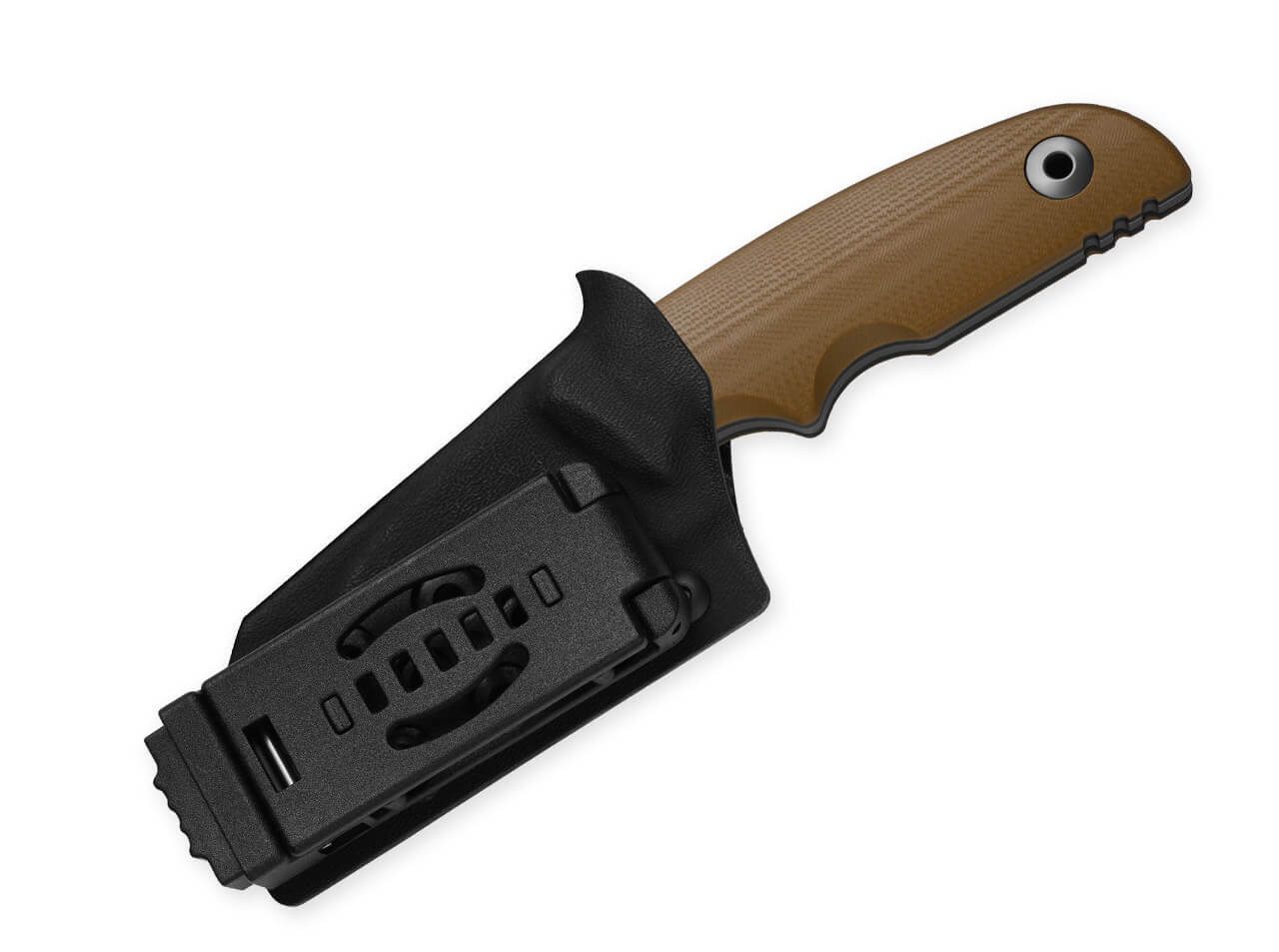 Designed by Kornel Kiss, the knife features brown G10 handle scales that provide a secure grip. The full-tang construction ensures maximum strength and power transfer. The knife comes with a custom-fit Kydex sheath for safe carry and quick access.