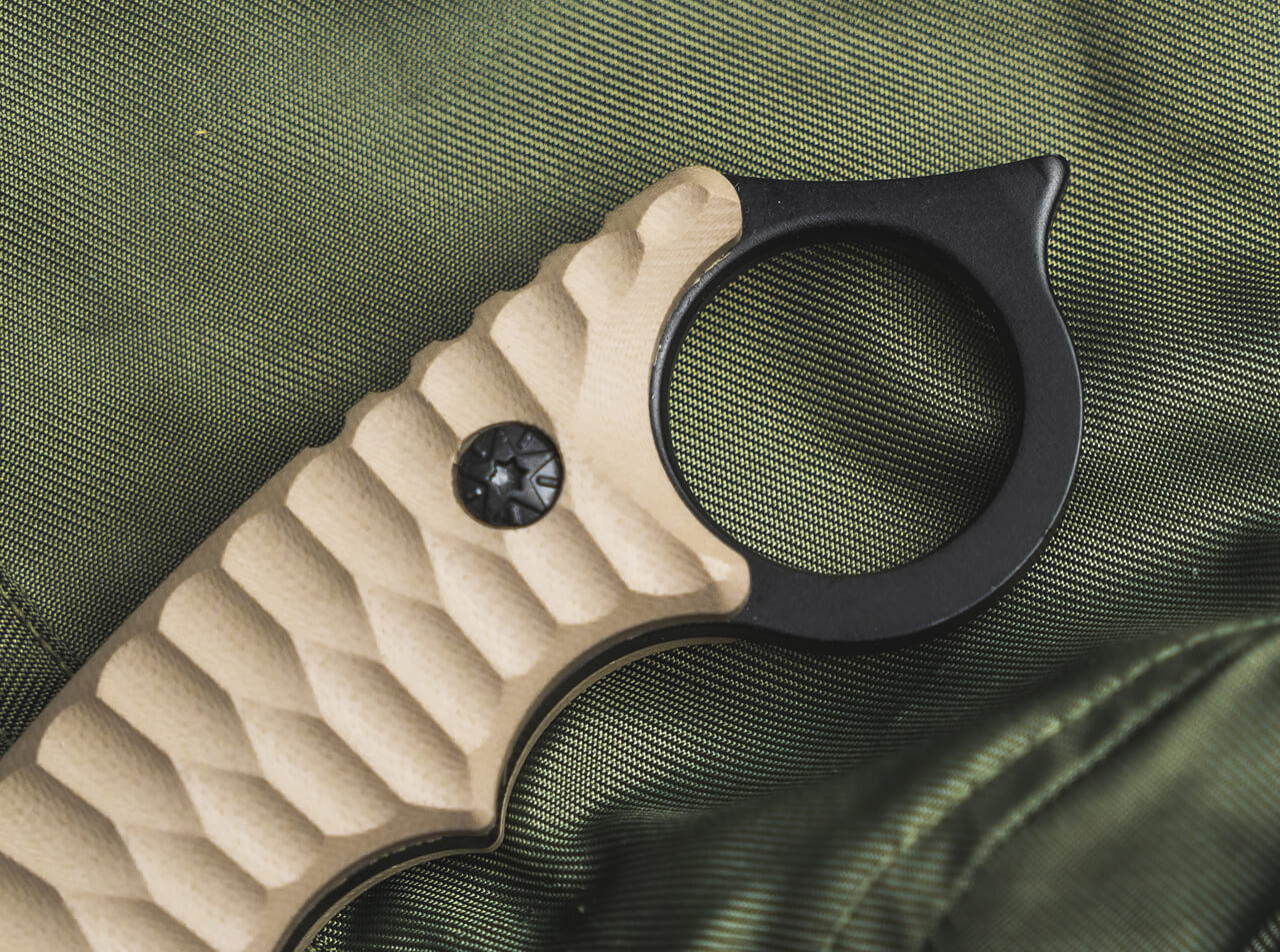 - Ergonomic G10 handle in a sand-colored khaki finish