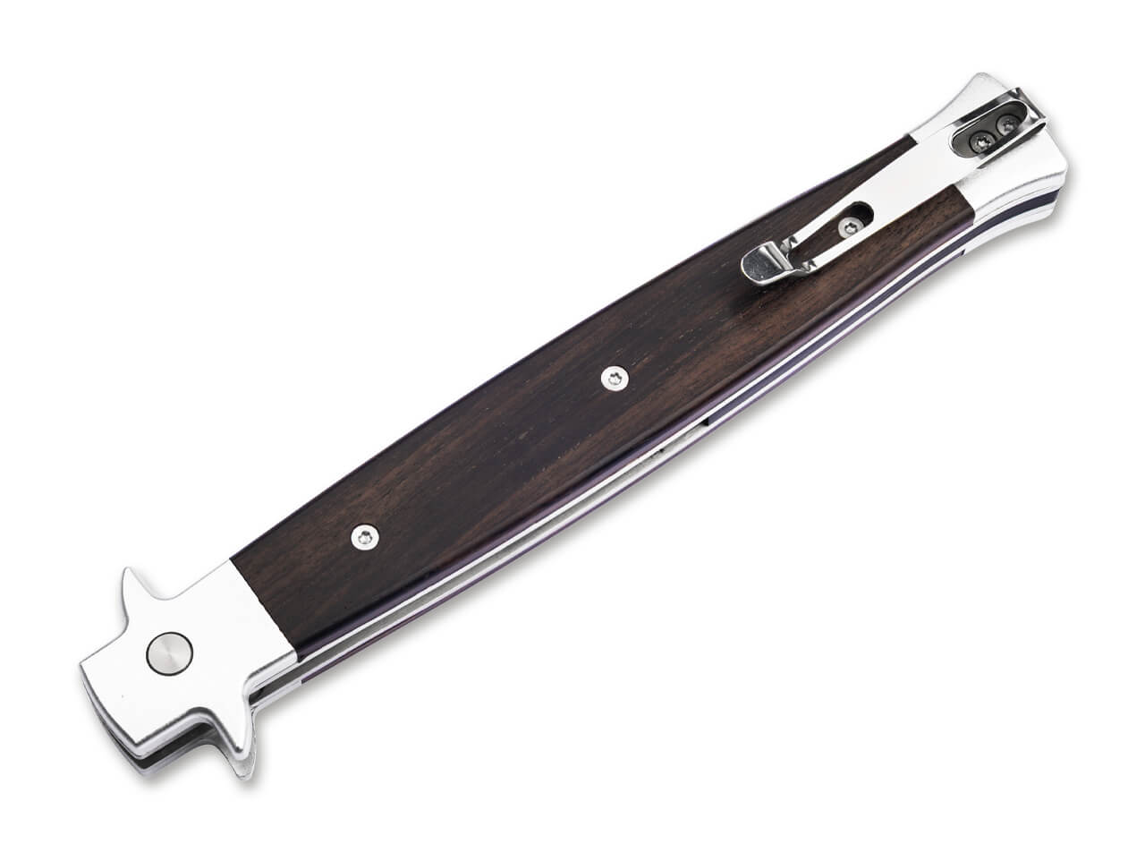 The square-profile handle made from ebony wood combines stainless steel bolsters, a protective guard element, and screwed handle scales to deliver both striking aesthetics and confident ergonomics. Spring-assisted opening via push button provides fast, dynamic deployment, while the Button Lock ensures secure lockup.