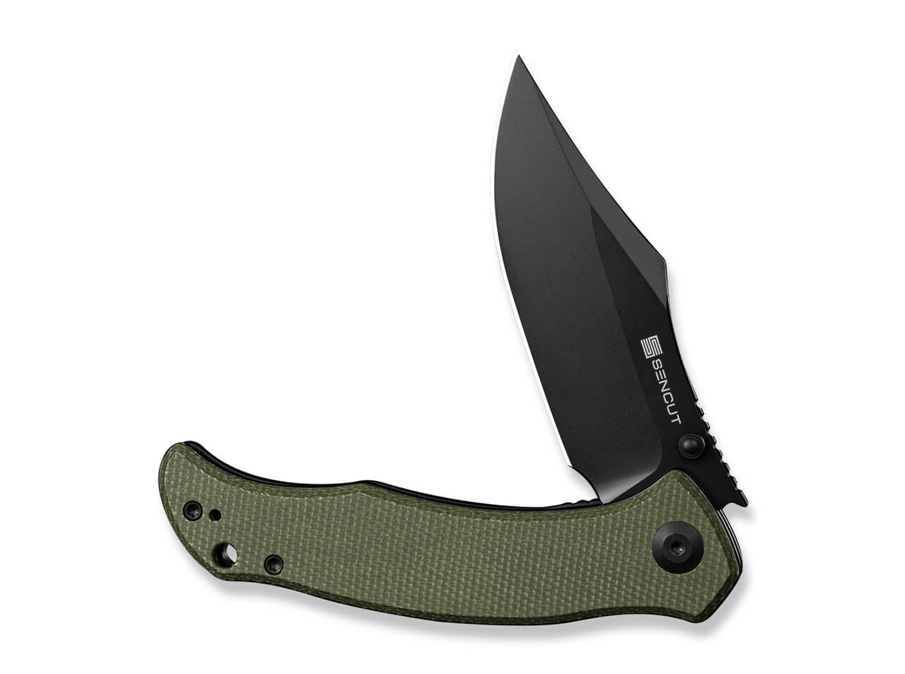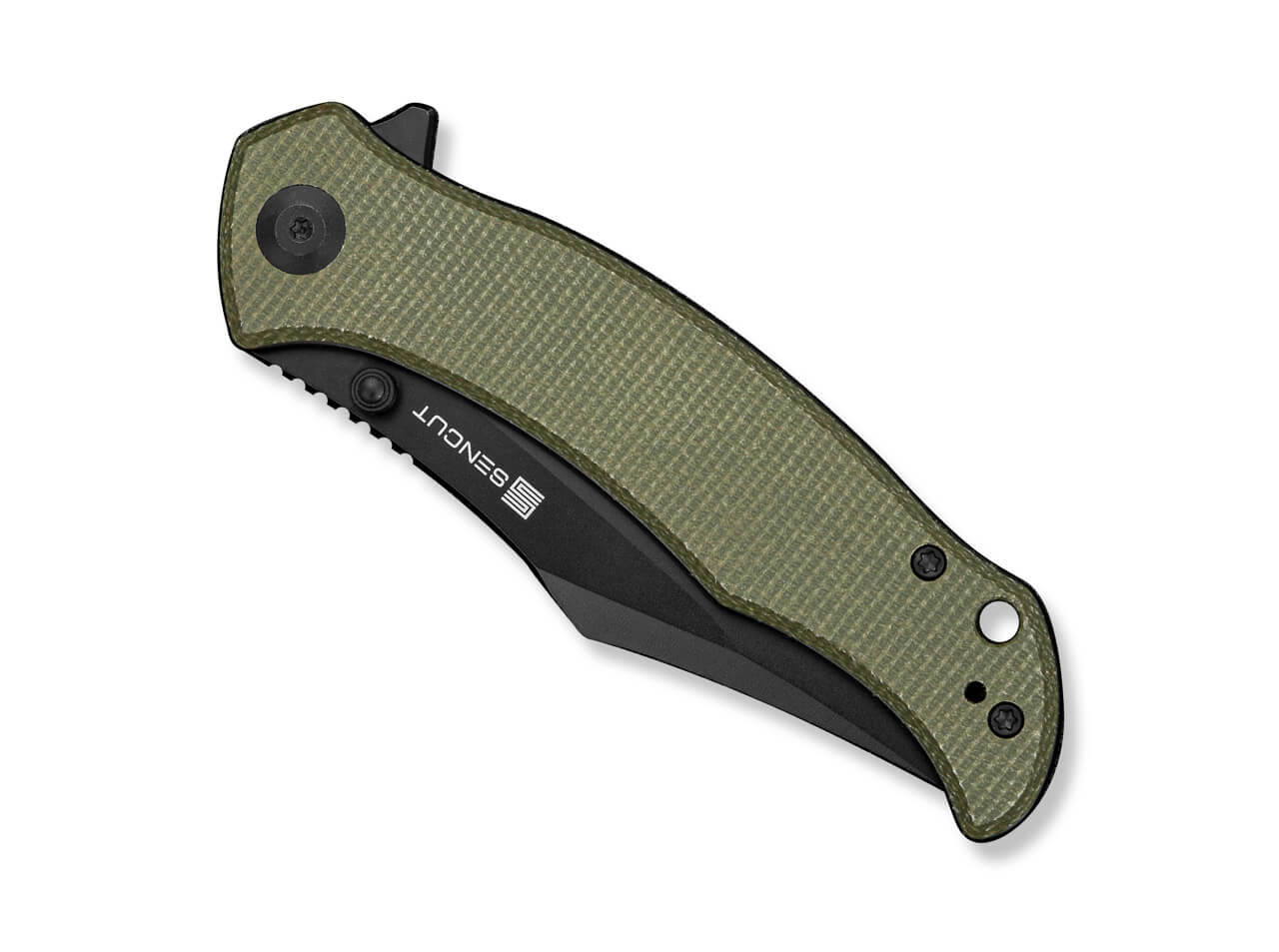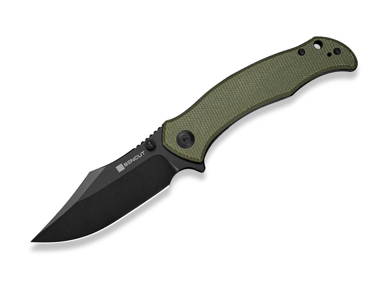 The SENCUT Tauron Flipper & Thumb Stud Knife with Olive Canvas Micarta handle is a reliable, versatile pocket knife for everyday carry. Its D2 steel clip-point blade in black delivers a sharp edge, long-lasting durability, and a rugged appearance.