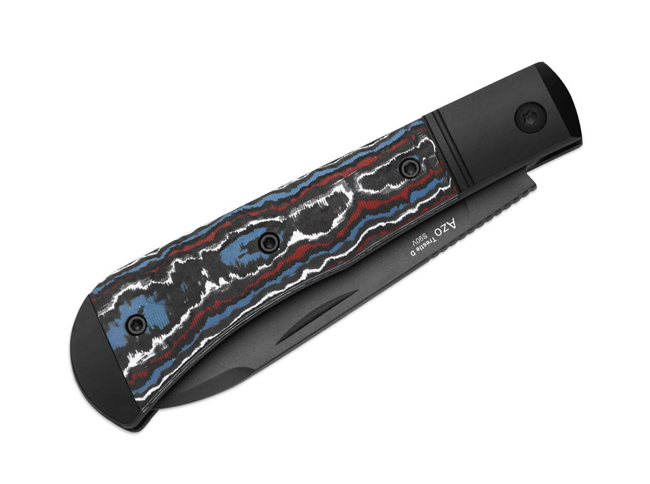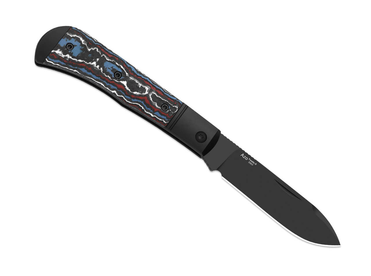 Designed by Azo, the knife features sturdy aluminum bolsters and handle inlays made of Fat Carbon, providing a secure grip and attractive appearance. The slip-joint mechanism allows smooth opening and closing without a lock, perfect for subtle everyday tasks.