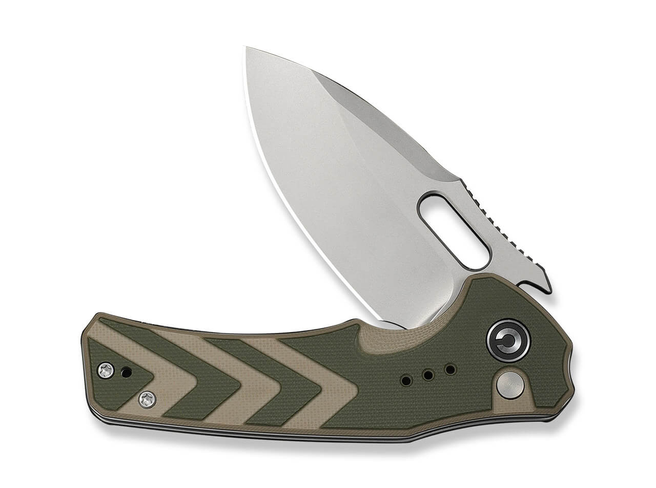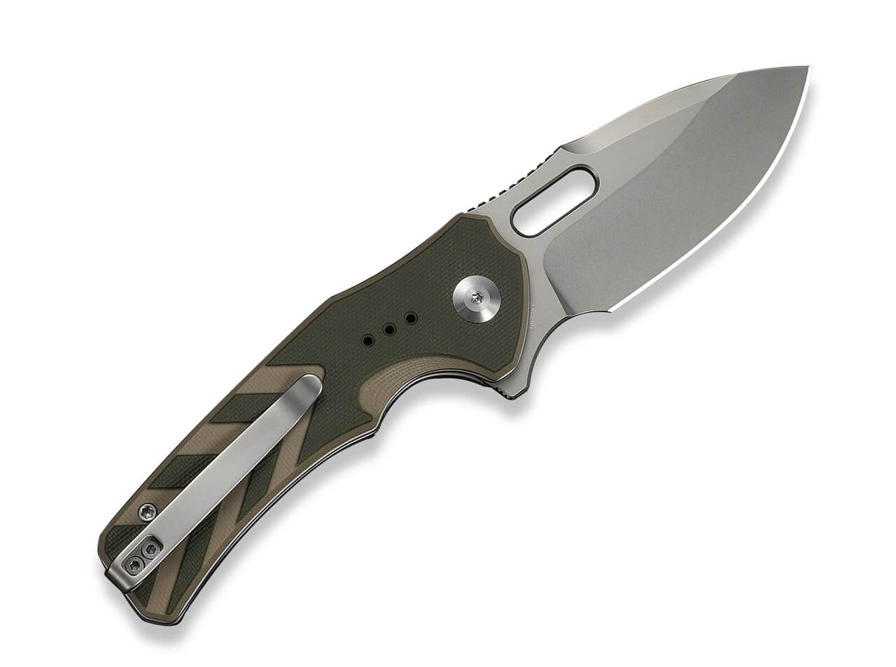 The CIVIVI Vexron with a green and tan G10 handle is a modern and versatile EDC pocket knife combining functional design with dependable performance. The durable 14C28N drop point blade features a stonewashed finish, helping to hide wear and maintain long-lasting utility.