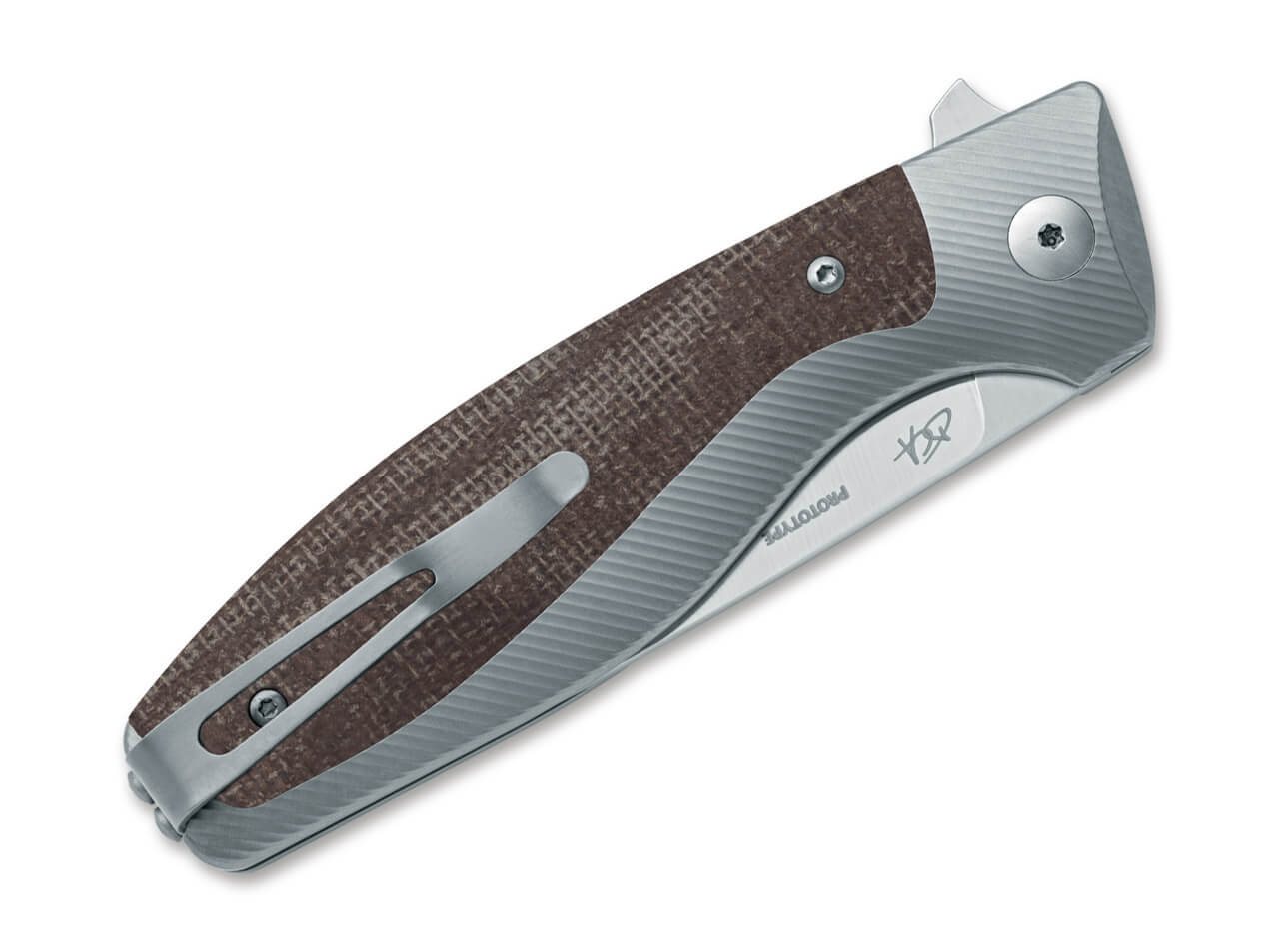 The sandblasted titanium handle is complemented by Natural Yute Micarta inserts, adding warmth, texture, and distinctive character. The blend of titanium and Micarta offers durability, grip comfort, and modern material aesthetics. A titanium button lock ensures secure and confident operation, while the flipper mechanism enables fast, smooth deployment. The shaped deep carry titanium clip (tip-up, right side) allows discreet pocket carry. Sandblasted AISI 303 screws complete the premium construction of this high-end folding knife.