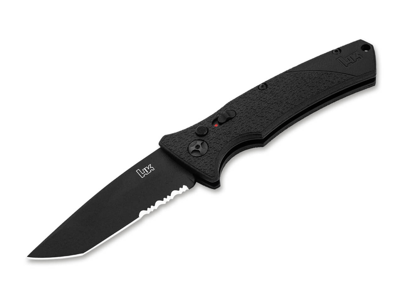 Die Heckler & Koch Automatikmesser FD01 & FD02 sind taktische No-Nonsens-Functionfolder reinsten Wassers. Die zuverlässigen Mechanismen mit seitlicher Klingenöffnung, Spiralfeder und Button Lock habe sich seit mehr als einem Jahrzehnt hunderttausendfach in den Springmessern der Serien Kalashnikov und Böker Plus bewährt. Für eine sicheres Führen ist der Lock mit einer zusätzlichen seitlich angebrachten Schiebesicherung ausgestattet. Die Klingen aus D2-Stahl sind schwarz beschichtet. Der Griff ist aus Stahlplatinen und faserverstärkten Nylon (FRN) aufgebaut. Das Nylon trägt die charakteristische Mond-und-Noppen-Textur der Griffe der militärischen und behördlichen Handfeuerwaffen von Heckler & Koch. Die Messer sind mit eine Taschen- und Gurtclip zur Trageweise Tip-Up (r) ausgestattet und existieren in zwei Varianten mit unterschiedlichen Klingenformen. Das Heckler & Koch FD01 ist die volltaktische Variante des Einsatzspringmessers mit robuster Tanto-Klinge und halbem Wellenschliff (Combo Edge) für das trenne faseriger Materialien wie Gurten und Seilen.