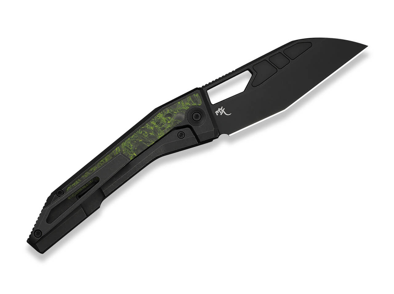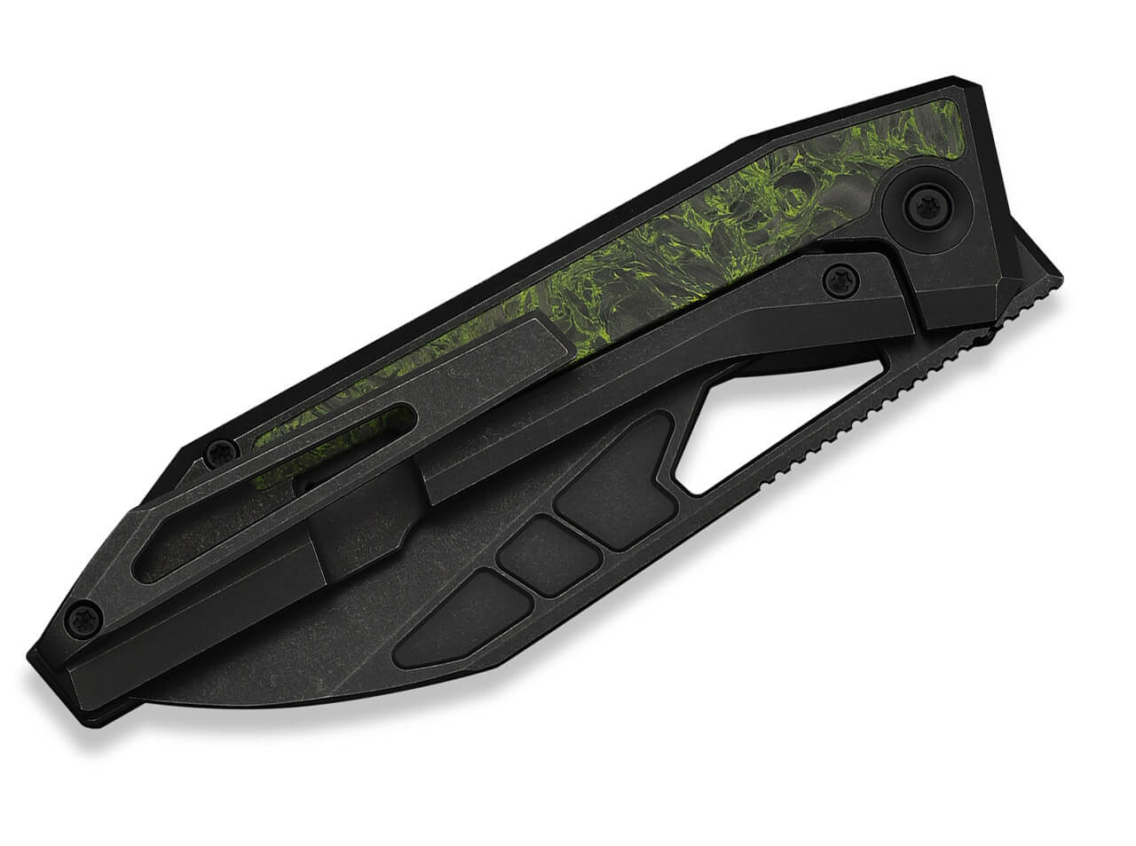 Der Griff aus 6AL4V Titan mit Green & Black Carbon Fiber Inlay verbindet Stabilität mit einer auffälligen, modernen Optik. Die Kombination aus schwarzem Titan und grün-schwarzer Carbonfaser erzeugt einen dynamischen Kontrast und unterstreicht den technischen Charakter des Messers. Carbonfaser ist bekannt für ihr geringes Gewicht und ihre hohe Festigkeit, während Titan für Robustheit und Langlebigkeit sorgt.