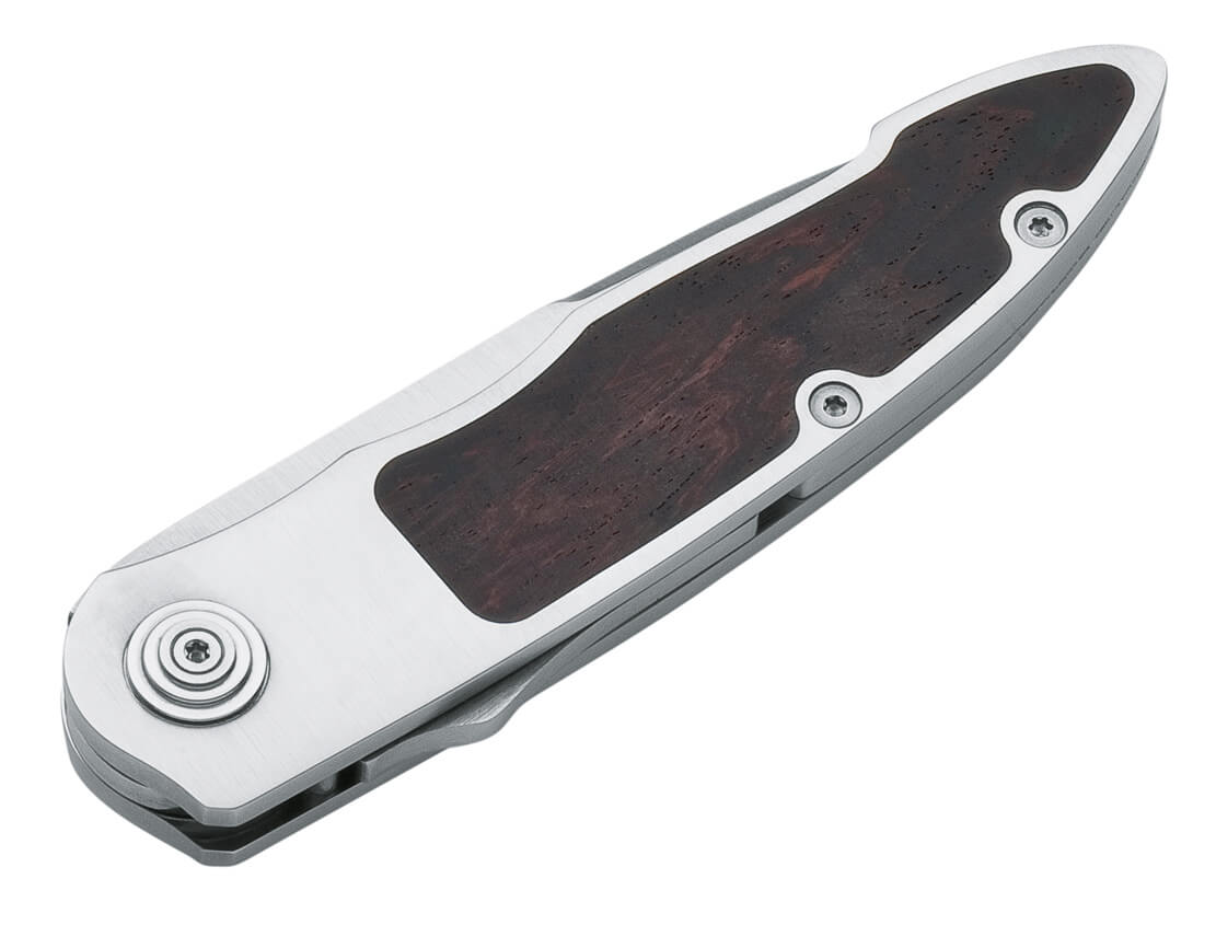 Der Solinger Messermacher Wilfried Gorski, Mitglied der Deutschen Messermachergilde, begeistert nicht nur durch seine technisch-eleganten Entwürfe und die hochpräzise Handarbeit, sondern auch durch seinen Erfindungsreichtum. Wir freuen uns sehr über die Zusammenarbeit und präsentieren mit dem Merlin ein typisches Gorski-Messer. Das Merlin wartet (erstmalig in Serienproduktion) mit dem sogenannten Interlock auf. Diese patentierte Verriegelung wird komfortabel über einen kleinen Schieber im Griffrücken betätigt, der zum Entriegeln gegen Federdruck zurückgezogen wird. Die Ganzstahlkonstruktion bietet trotz der flachen, schlanken Bauweise hohe Reserven hinsichtlich der Stabilität, was auch durch die Wahl von N690 als Klingenstahl unterstrichen wird. Die sauber eingepasste Griffeinlage aus zertifiziert importiertem Palisander setzt den besonderen Akzent. Als echtes Gentleman-Messer begeistert das Merlin nicht nur Sammler und Nutzer, sondern auch den technikbegeisterten Messerfreund. Satinierte Klinge. Ohne Clip.
