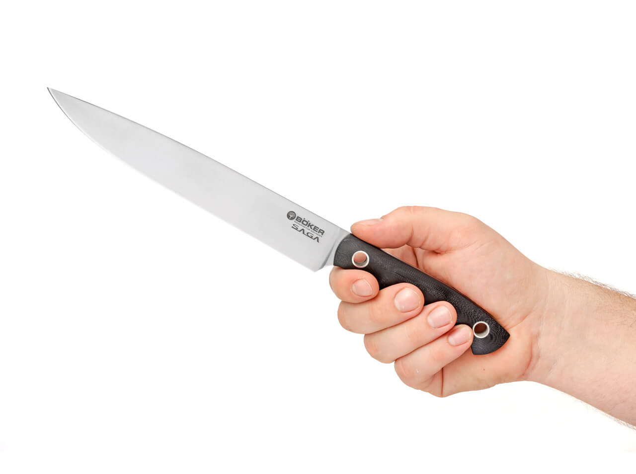 Die sanft geschwungenen Griffe werden aus unverwüstlichem schwarzen G10 gefertigt, das weder gegen Temperatur noch gegen Feuchtigkeit empfindlich ist. Schon bei der ersten Kontaktaufnahme mit der Messerserie Böker Saga wird die gelungene Ergonomie deutlich: Jeder Bogen, jeder Schwung in der Linie schmiegt sich an seine Stelle in der Hand und vermittelt eine absolute Kontrolle und ein überragendes Schneiderlebnis. Das schwalbenschwanzartig verbreiterte Griffende der größeren Modelle bringt zusätzliche Griffsicherheit. Die hohe Stabilität verdankt Böker Saga dem komplett durchgehenden Erl, der das Messer (in der gleichen Bauweise wie viele Jagdmesser) von der Klingenspitze bis zum Griffende durchzieht. Für eine optimale Schneidleistung steht nicht nur der komplette Flachschliff der Klinge mit Satin-Finish, sondern auch die Wahl von 440C als Klingenstahl, der hinsichtlich Schnitthaltigkeit und Korrosionsbeständigkeit übliche Küchenmesserstähle weit übertrifft. Den besonderen Akzent setzen die großen Hohlnieten, die unverkennbar die Handschrift von Jesper Voxnæs tragen.