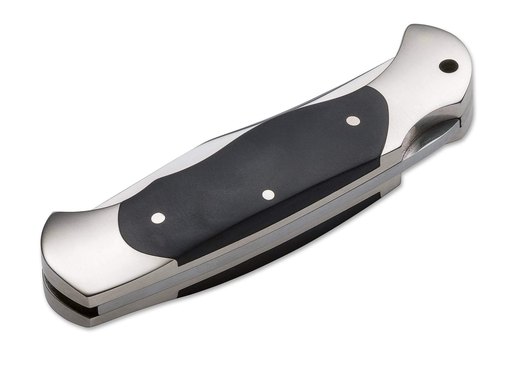 Die im Innern des Griffes verborgene Mechanik besteht aus einer Bolzenwippe und einer Feder. Bei ausgeklappter Klinge greift die Bolzenwippe in eine Aussparung der Klinge und arretiert sie dadurch. Das hintere Ende der Bolzenwippe wird nicht vollständig vom Griff verdeckt, sondern liegt am Griffrücken zum Teil frei, damit sie betätigt werden kann. Wird nun das freiliegende hintere Ende der Bolzenwippe gedrückt, hebt sich der Haken aus der Kerbe, sodass sich die Arretierung löst und die Klinge eingeklappt werden kann. Die preislich besonders interessante Variante mit Kunststoffbeschalung besitzt angenehm geformten Griffschalen aus ABS, die das harmonische Bild des Klassikers abrunden. Kunststoffschalen sind hinsichtlich ihrer Unempfindlichkeit gegen Nässe auch unter widrigen Wetter- und Umweltbedingungen in vielen Bereichen erste Wahl.