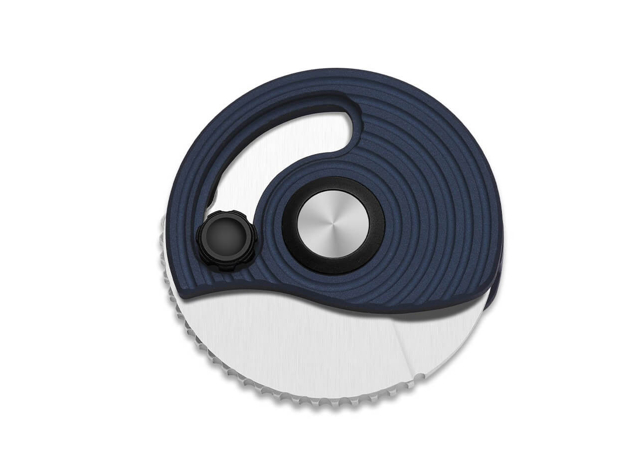 Der kreisrunde Griff aus blauem Aluminium mit spiralförmig strukturierten Bahnen erinnert optisch an eine Schneckenspur und sorgt gleichzeitig für eine interessante Haptik.