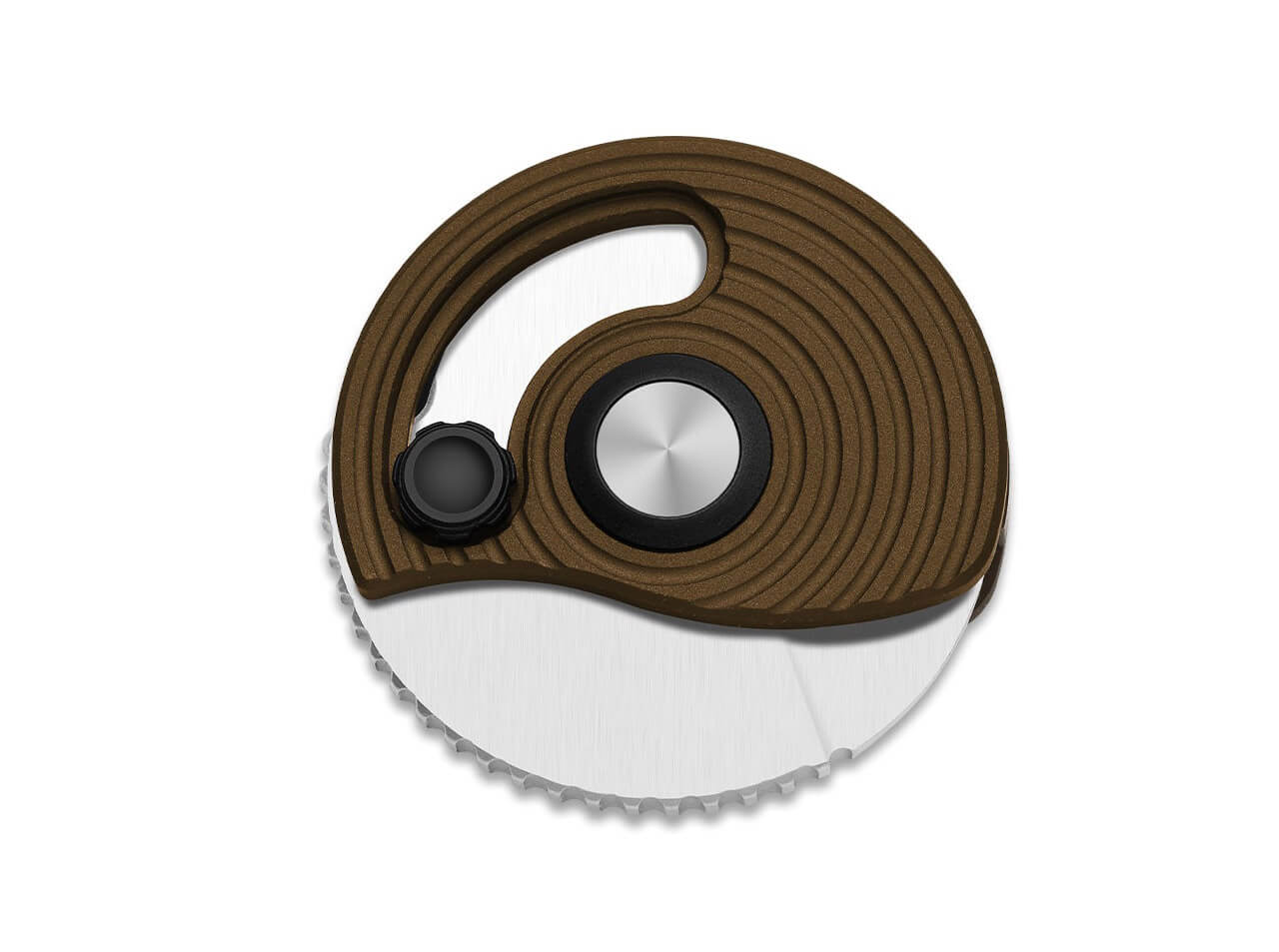 Der kreisrunde Griff mit spiralförmig strukturierten Bahnen erinnert optisch an die Spur einer Schnecke und sorgt gleichzeitig für eine interessante Haptik.